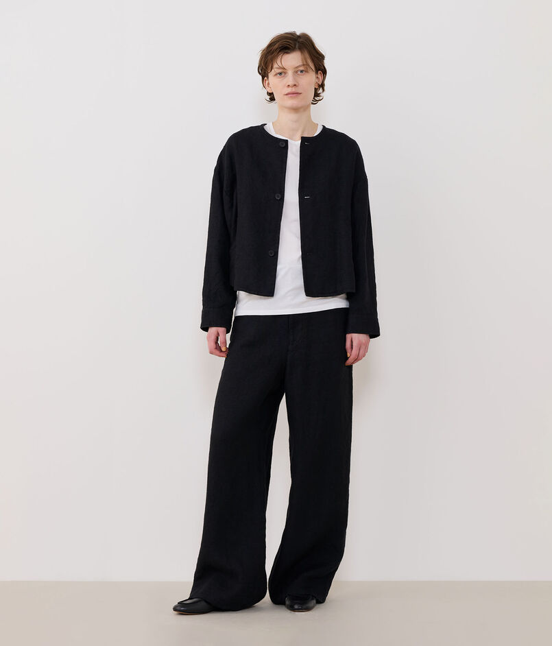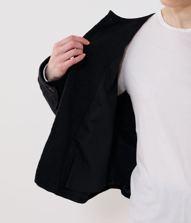 コンパクトな着丈なのでワイドボトムスとはもちろんワンピースに羽織ったりさまざまなコーディネートで活躍。