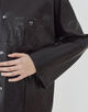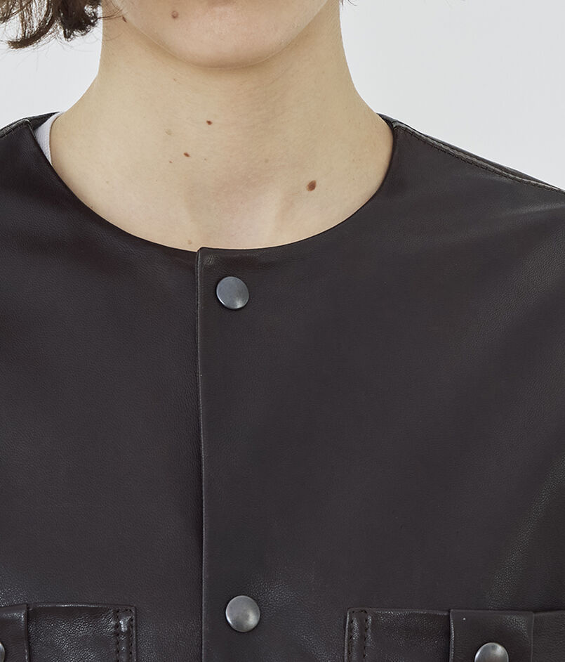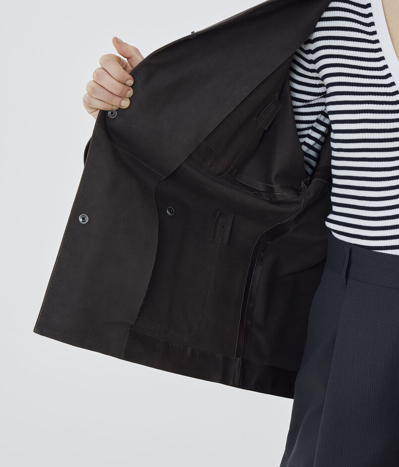 深みのあるダークブラウンと上品な艶が美しいジャケット。