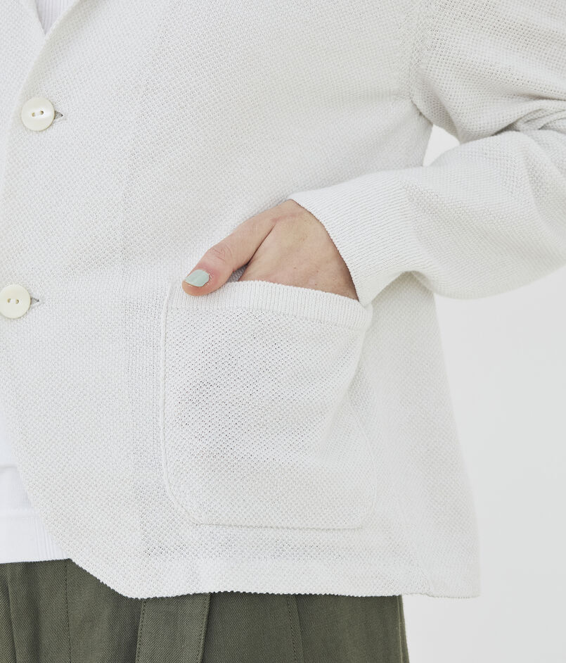 前端やヘムラインは縫製で布帛のジャケットのようなシルエットに、襟や袖口・ポケットは完全成型で編んでいます。