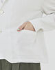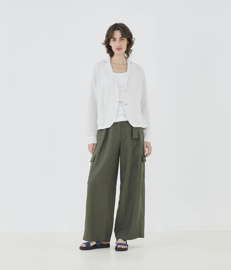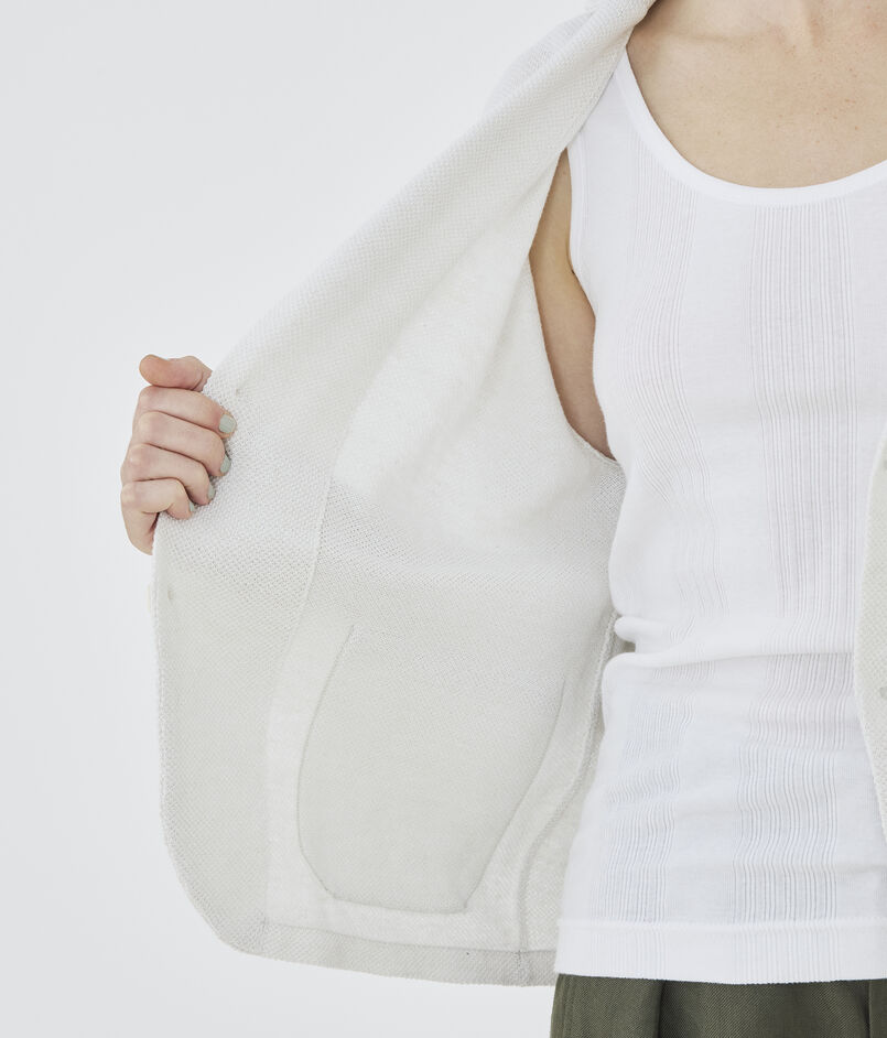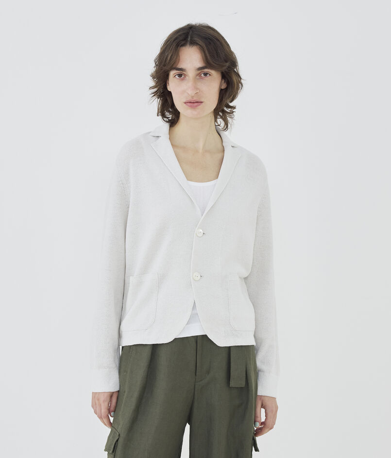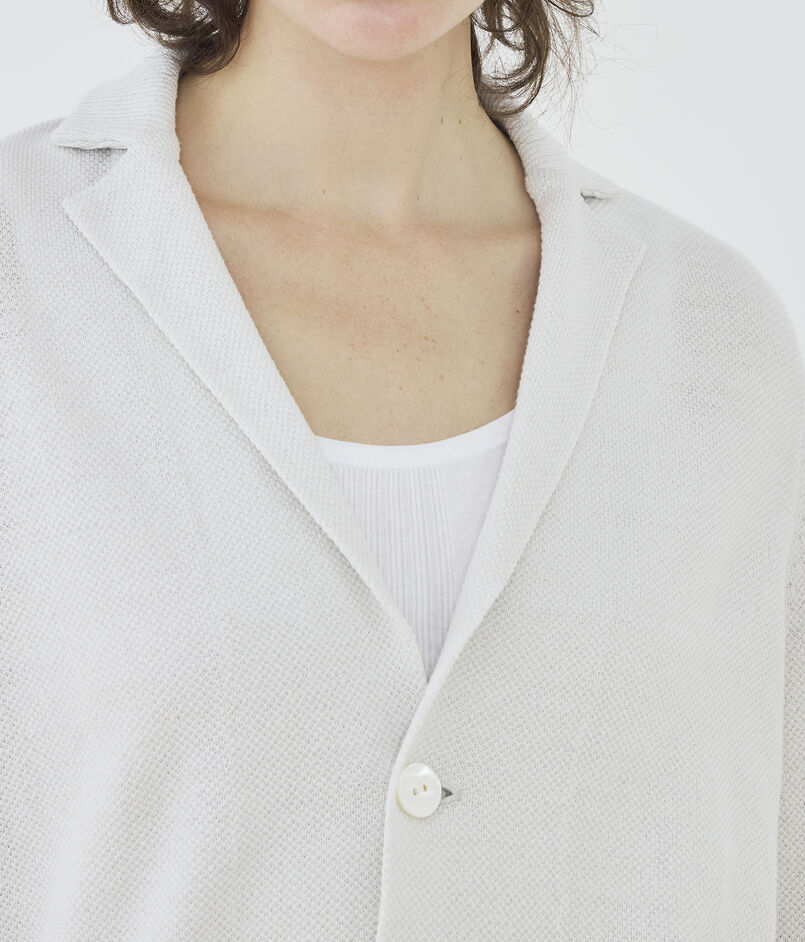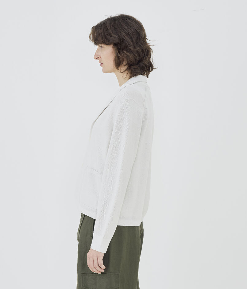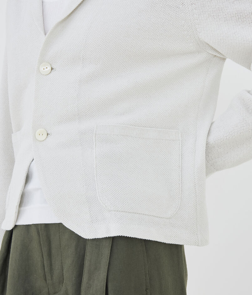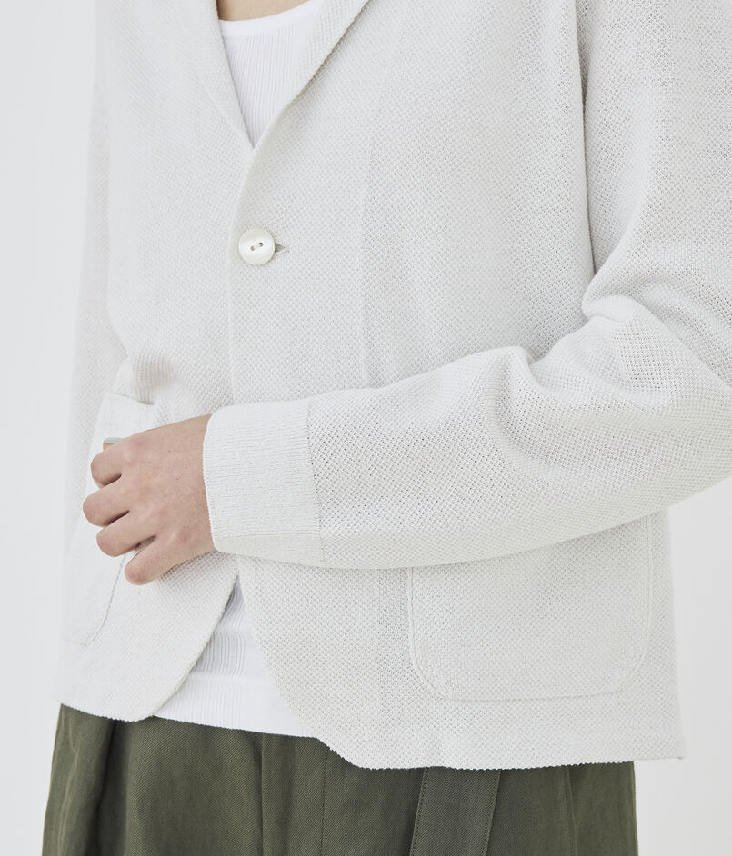 前端やヘムラインは縫製で布帛のジャケットのようなシルエットに、襟や袖口・ポケットは完全成型で編んでいます。