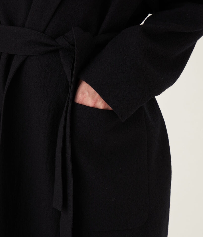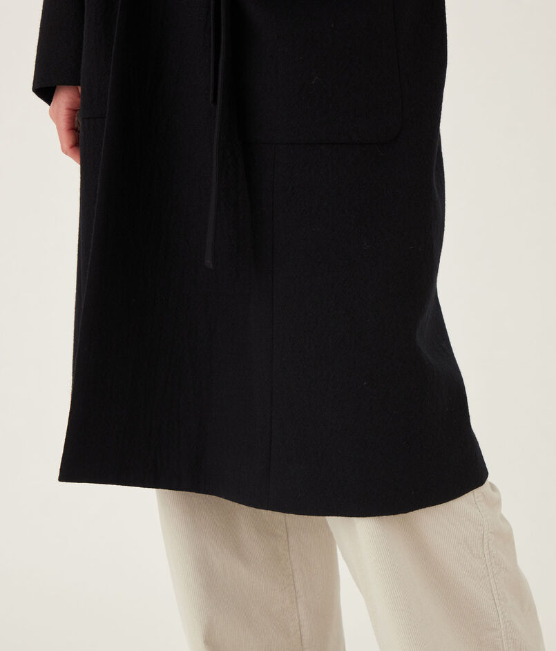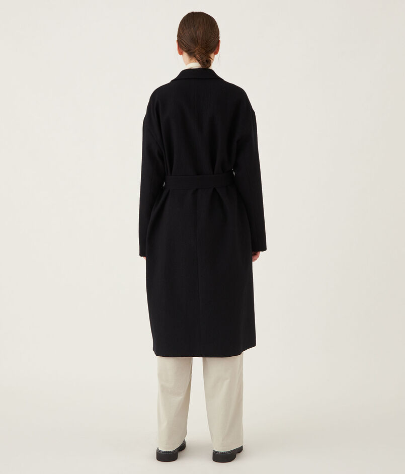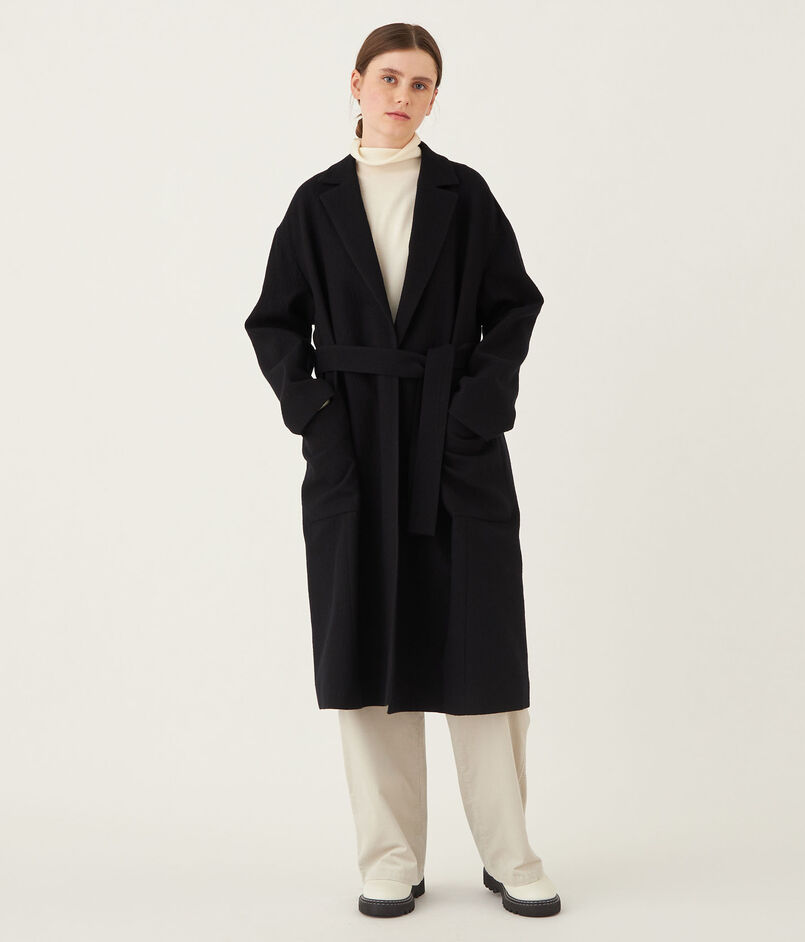 身体を包み込むゆったりとしたボディとノーボタンのデザインで、マニッシュなパンツやワンピースに合わせても気負うことなくスタイルが完成します。