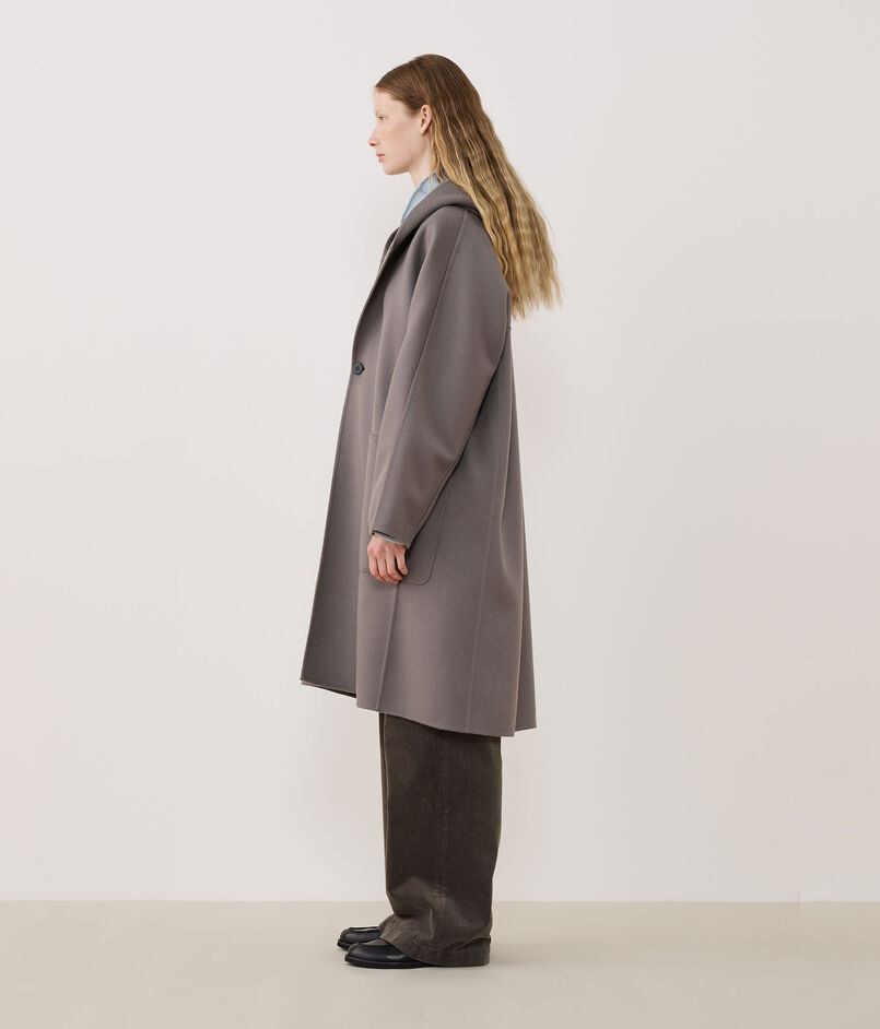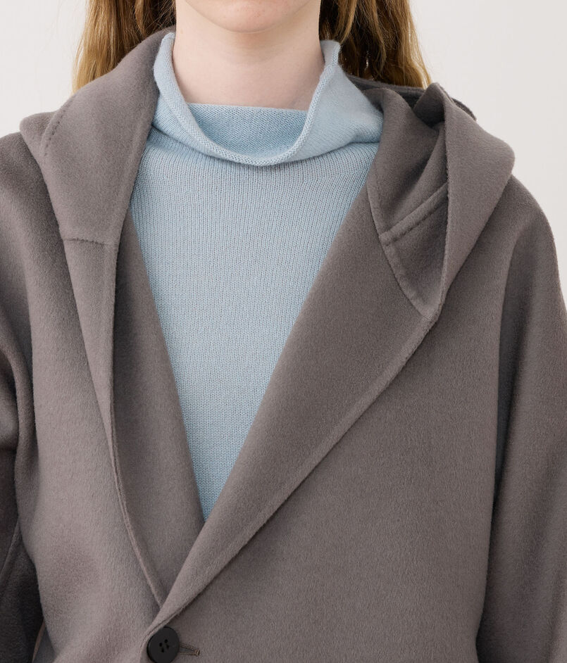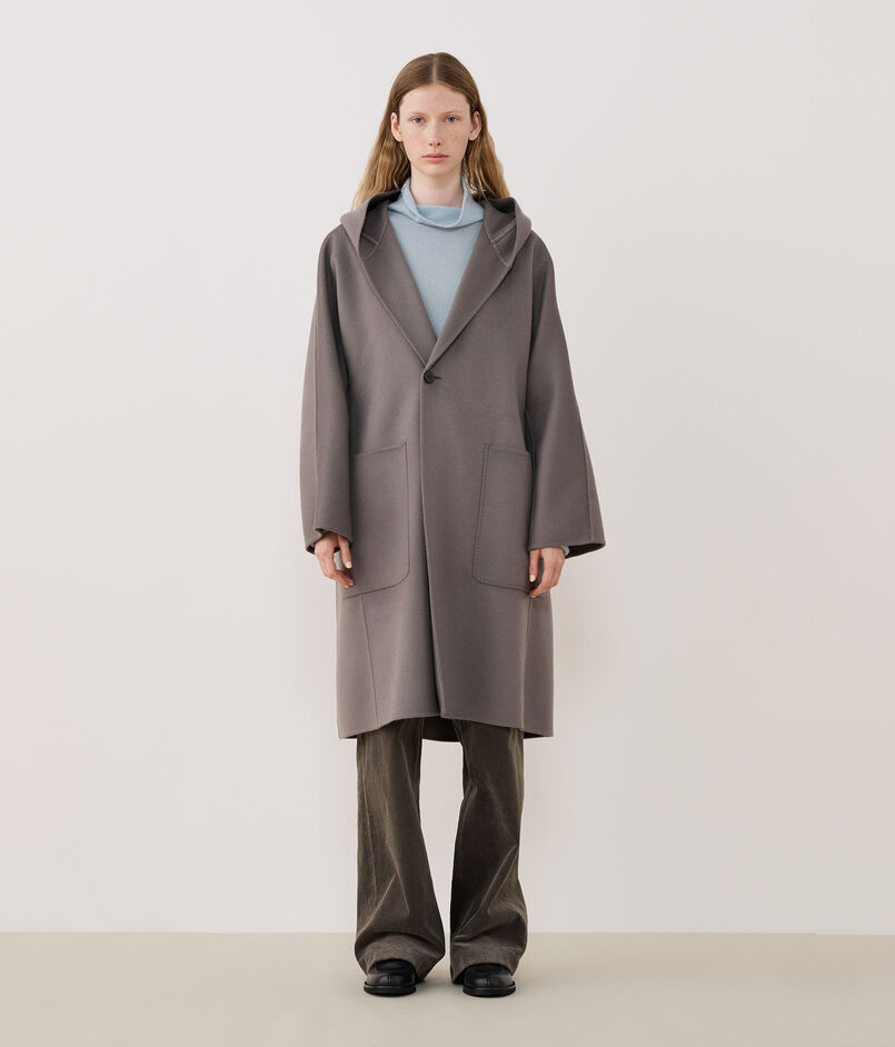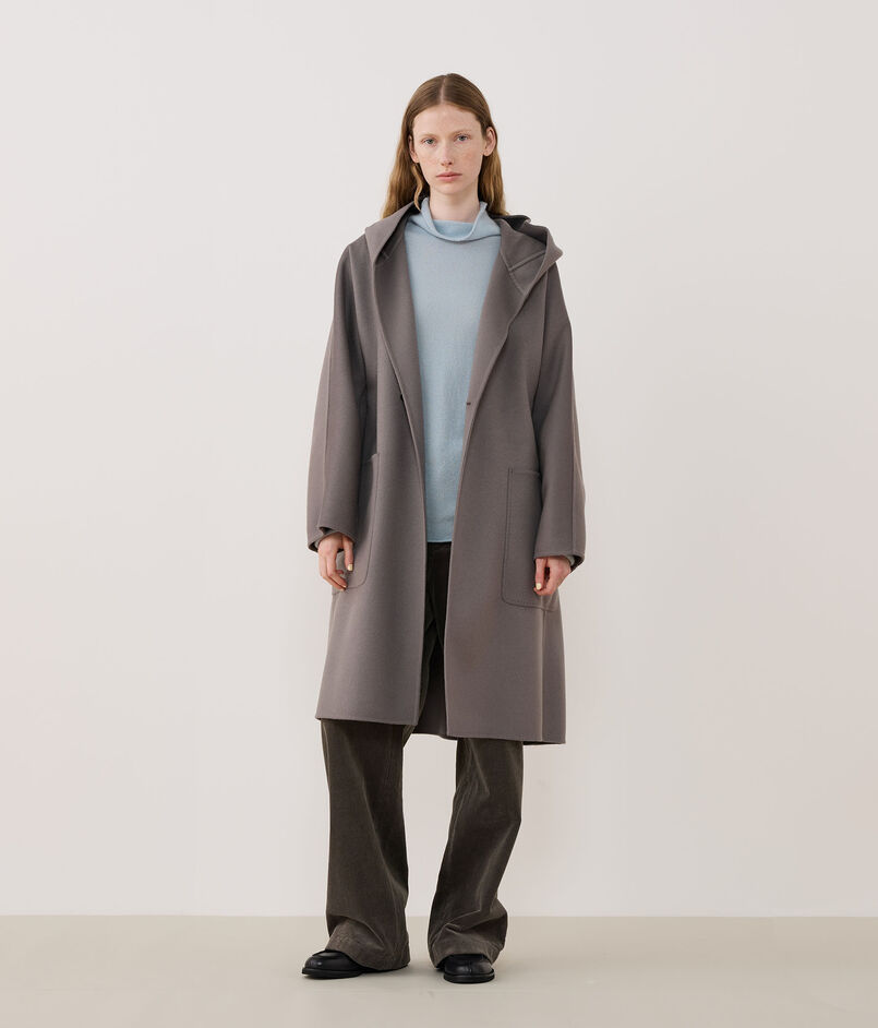 今季新たに登場したフーデッドコートはほど良い分量感があり、羽織るだけで様になる一着。