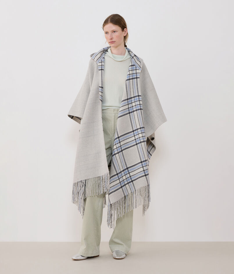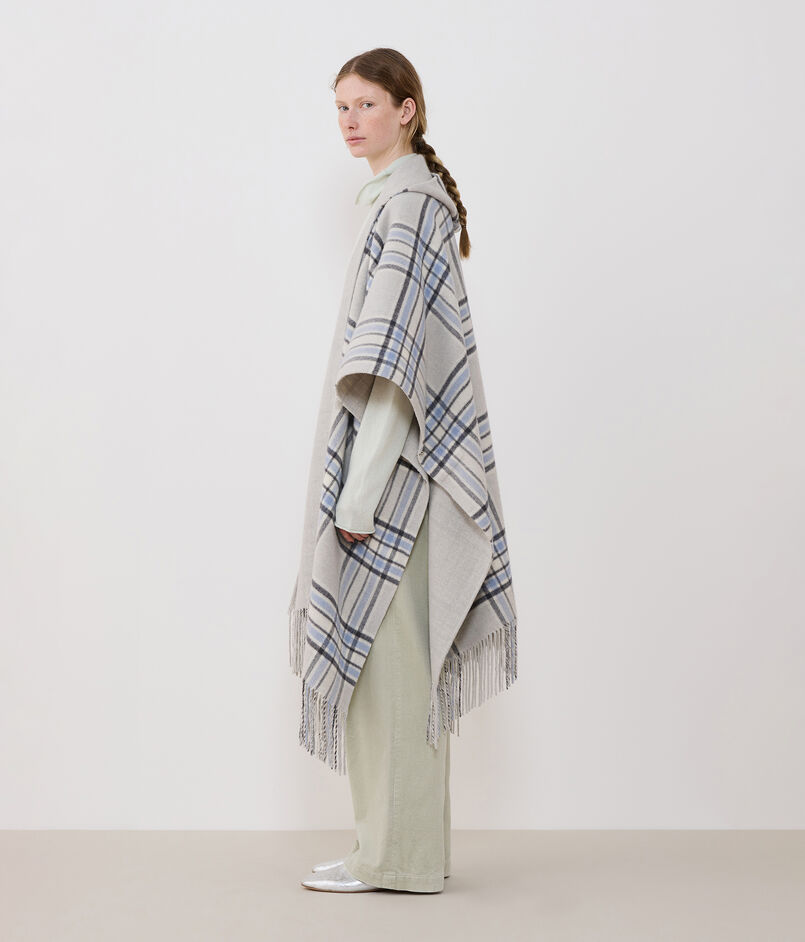フードとフリンジをアクセントに仕立てたポンチョは、さらりと羽織るだけで抜け感のあるスタイルが決まる一着。