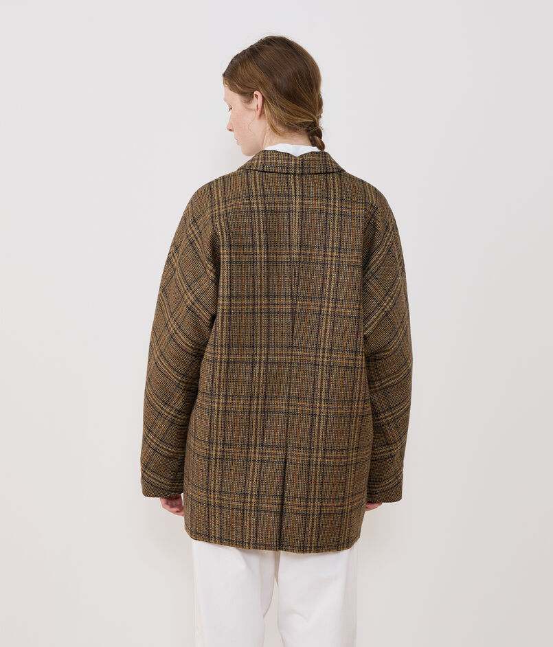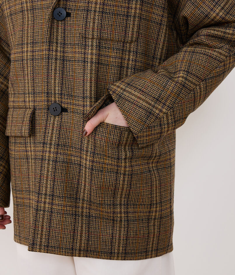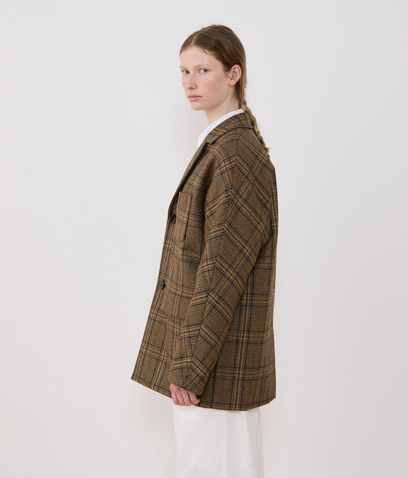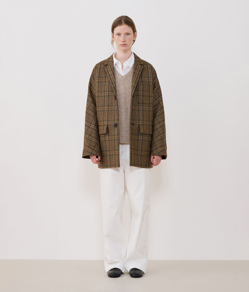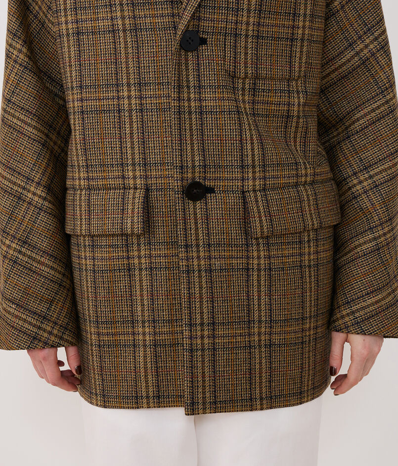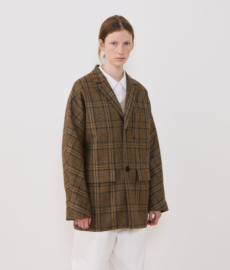 英国調のトラッドな雰囲気が感じられつつ、ドルマンスリーブの柔らかなフォルムと大きなポケットのデザインで女性らしく気崩せるよう仕立てています。
