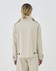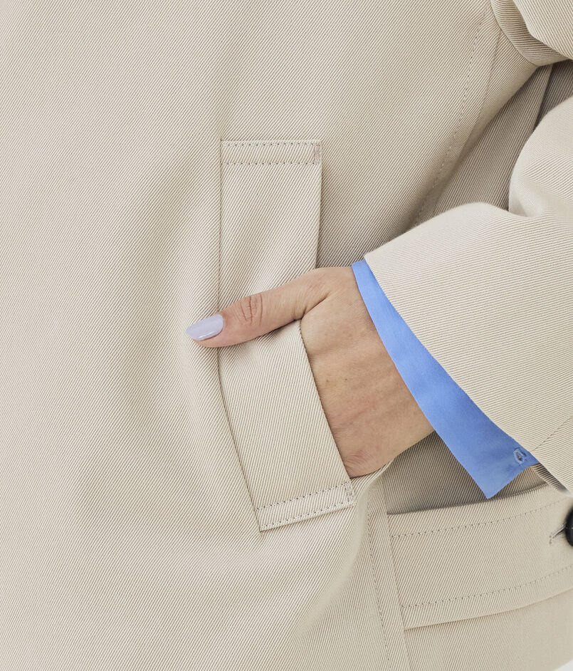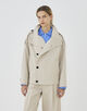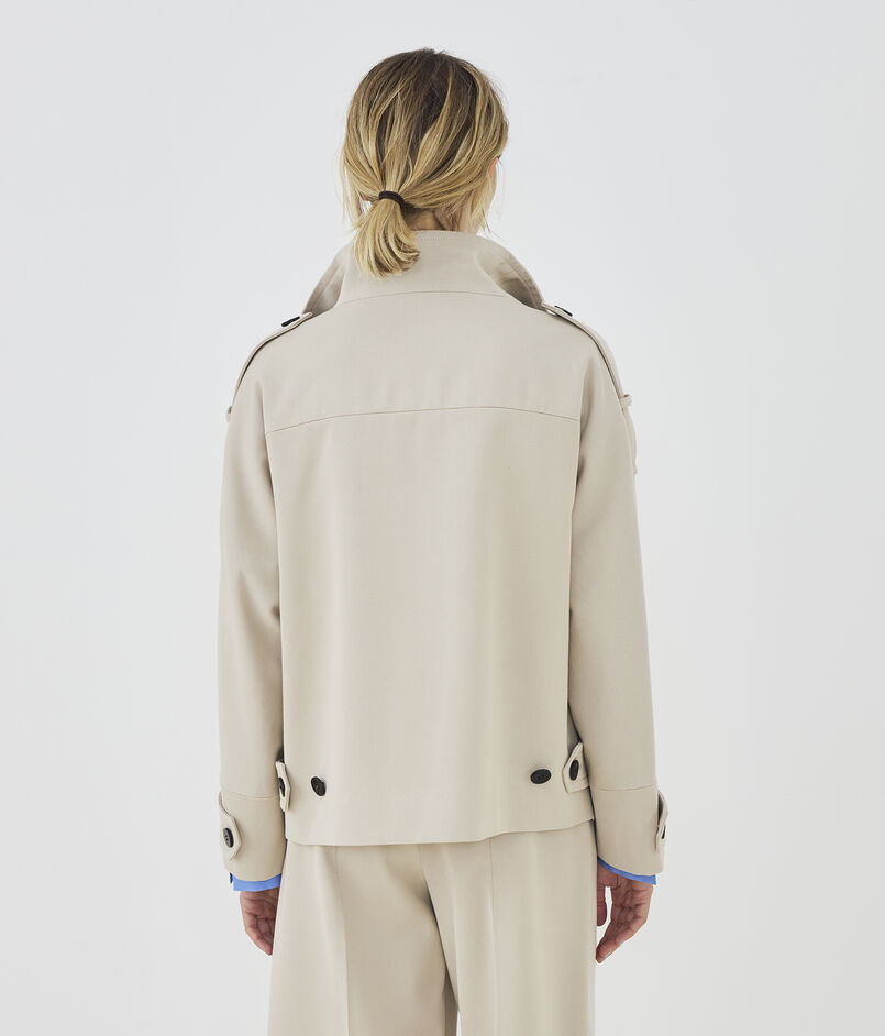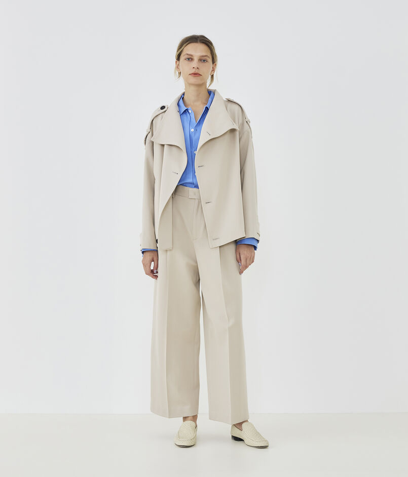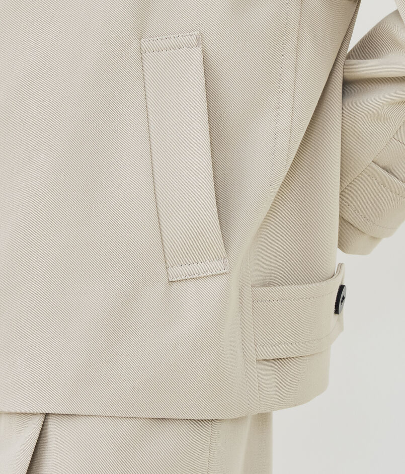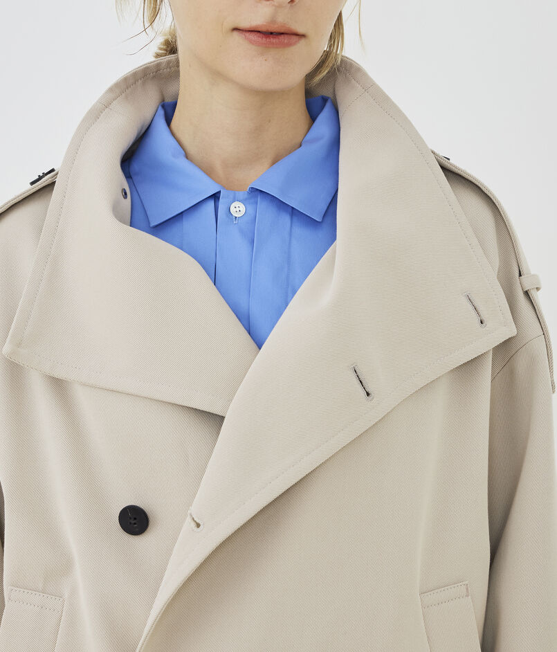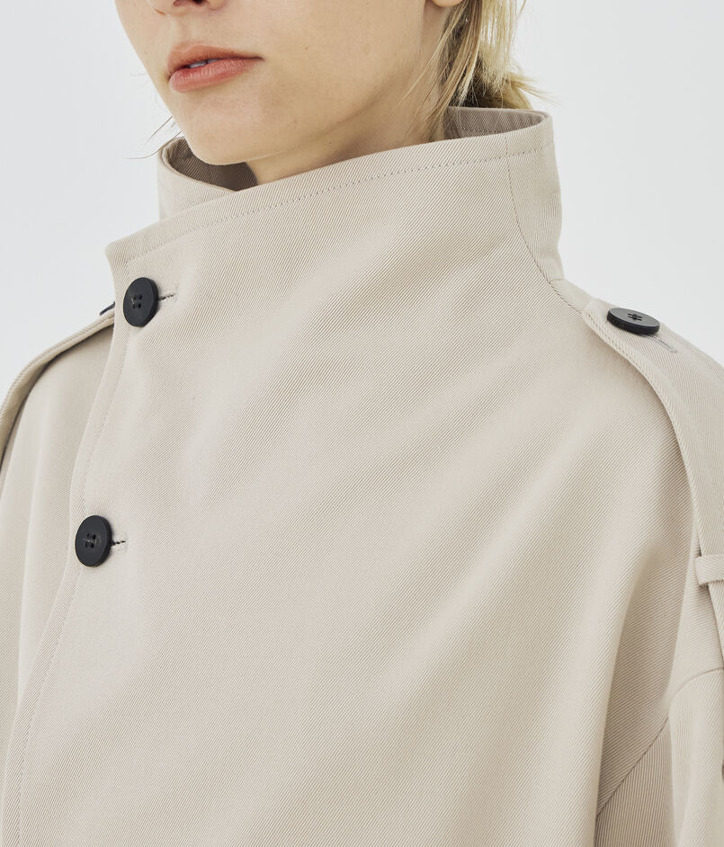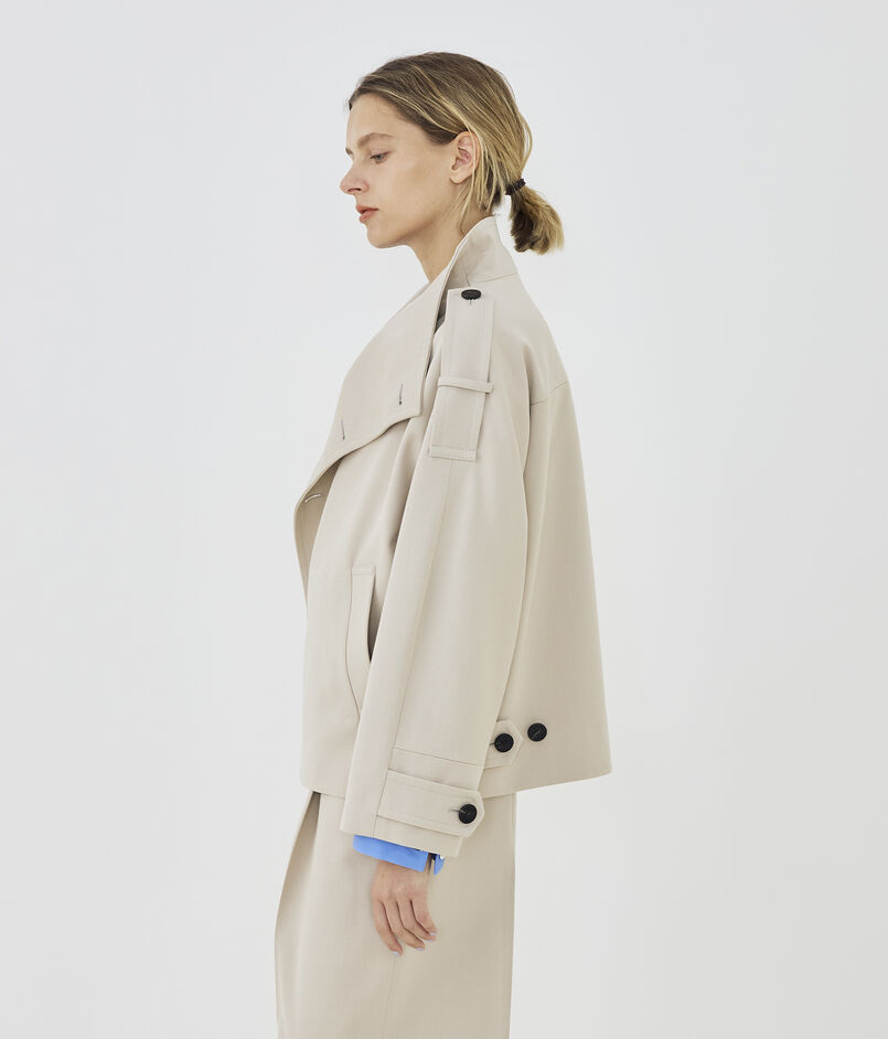 ショートコートはほのかに丸みのあるオーバル型にトレンチコートのディテールを取り入れた一着。