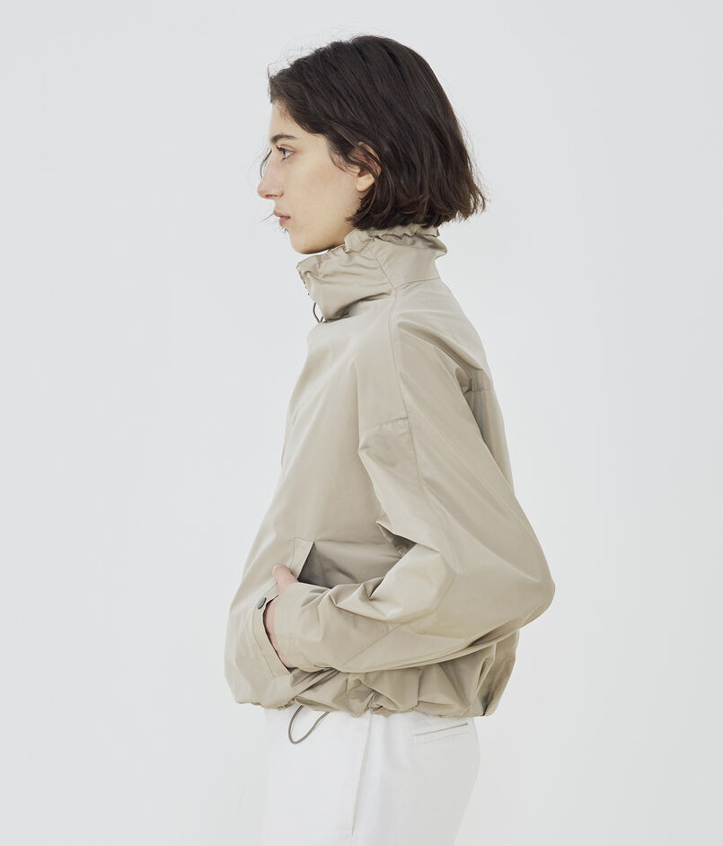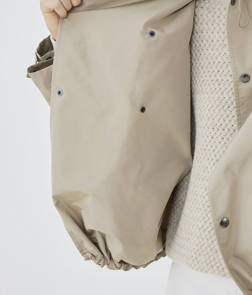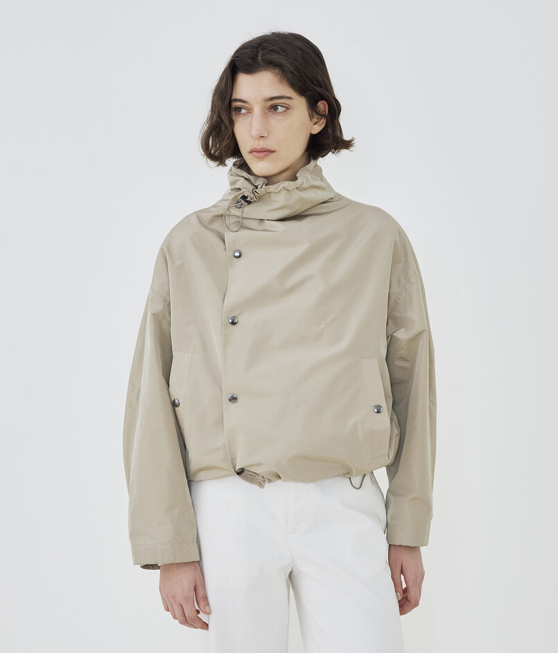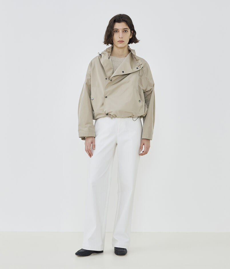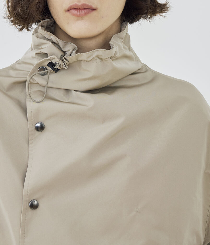 襟と裾はドローストリングでアジャストでき、着こなしに合わせてシルエットを変えて着用可能。