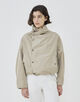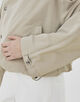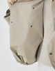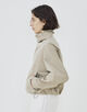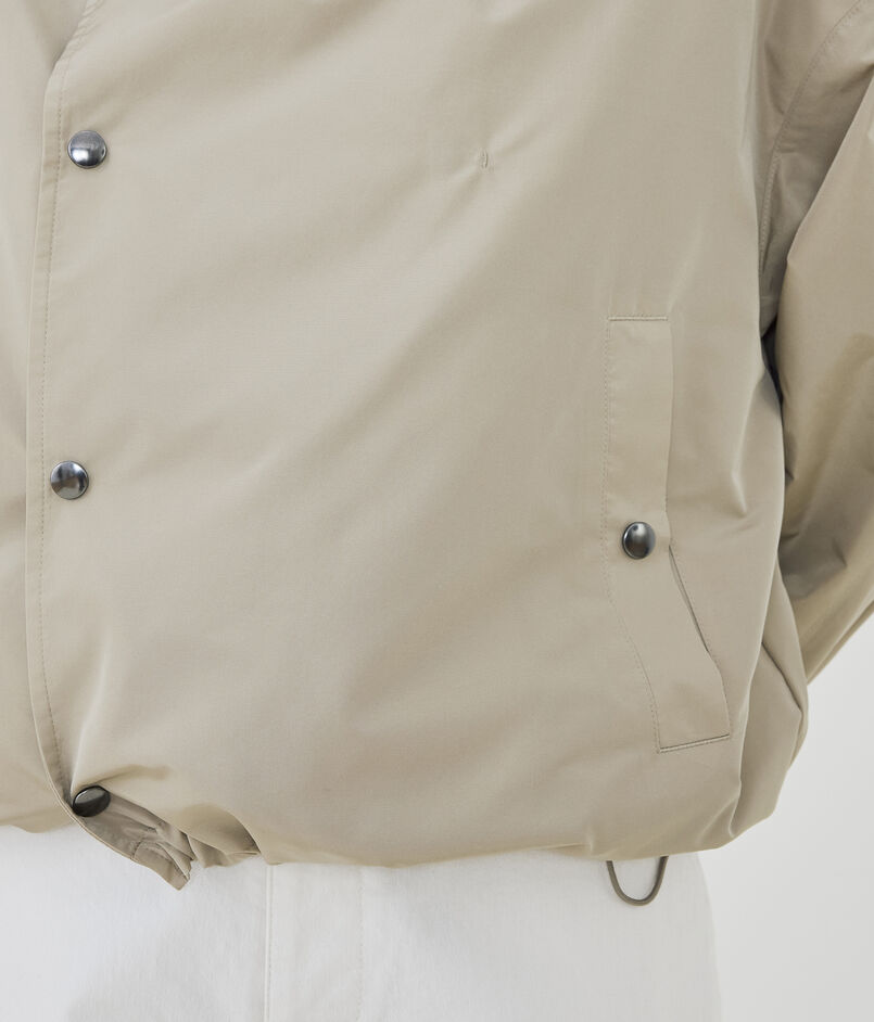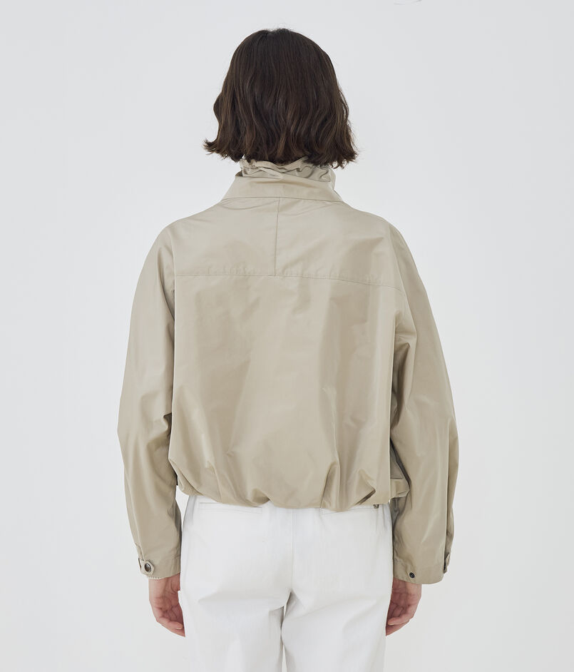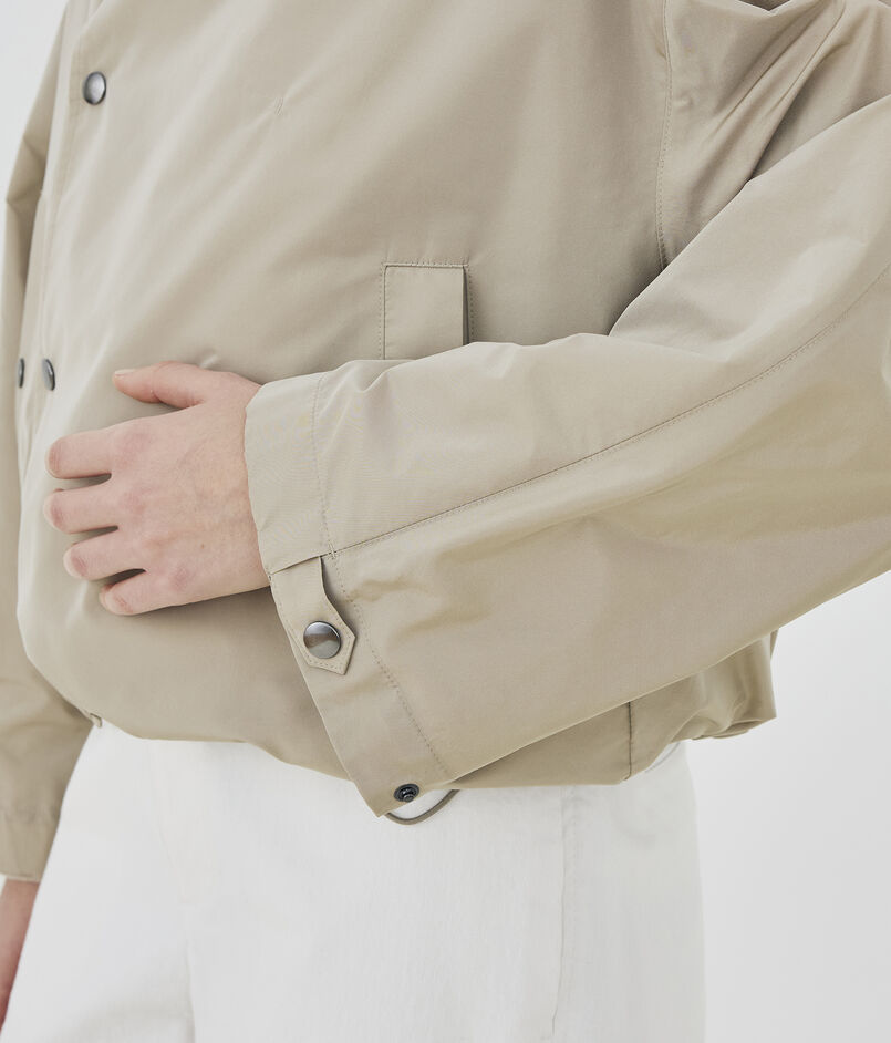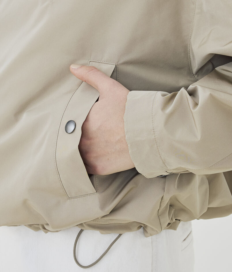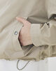 襟と裾はドローストリングでアジャストでき、着こなしに合わせてシルエットを変えて着用可能。
