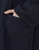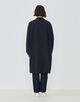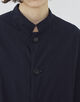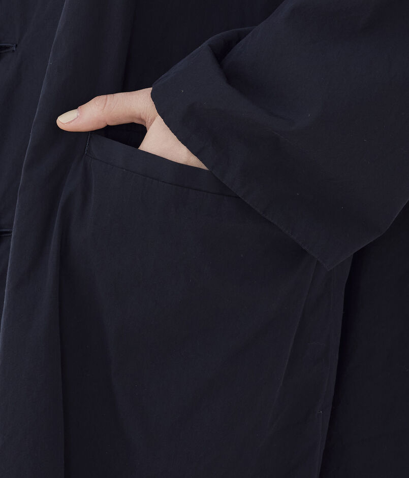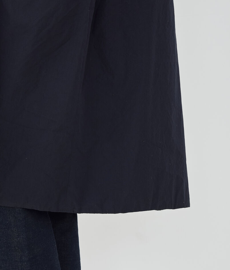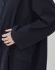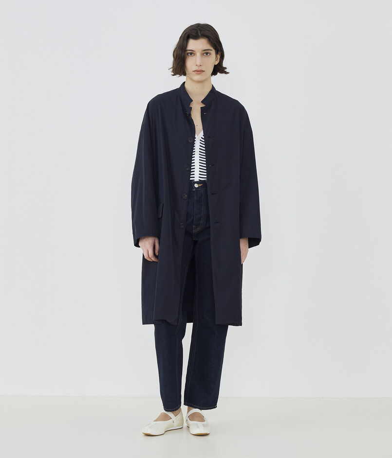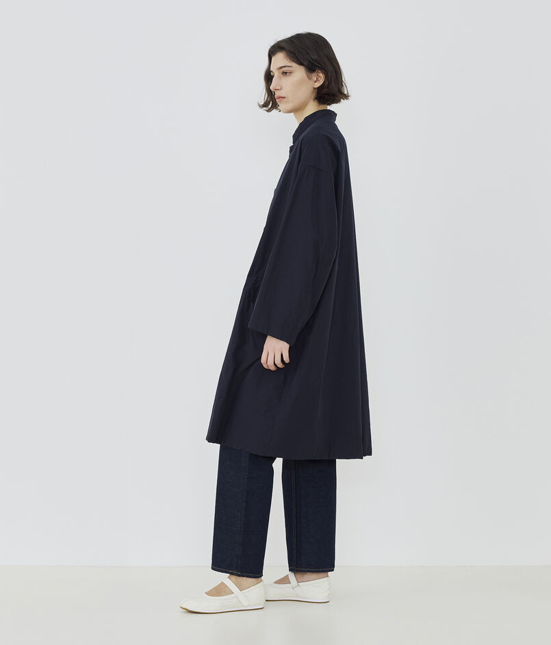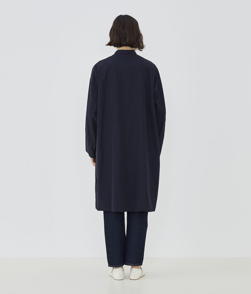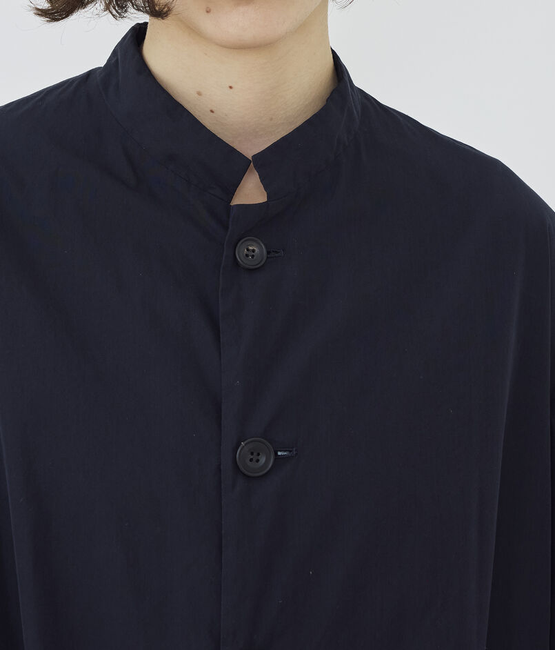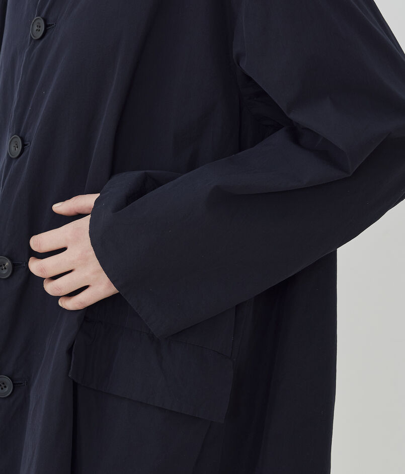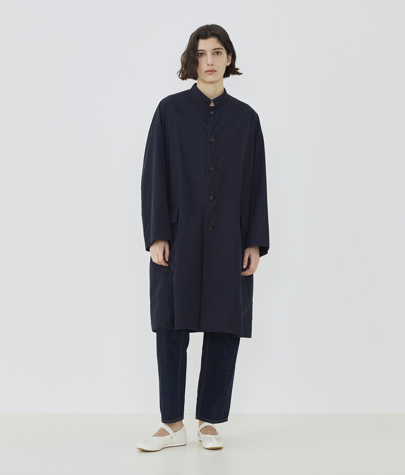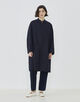 コートは小さな衿がポイントで、そのままスタンドカラーとして着用したり折り返してチェスターコートのようにも着用可能。