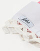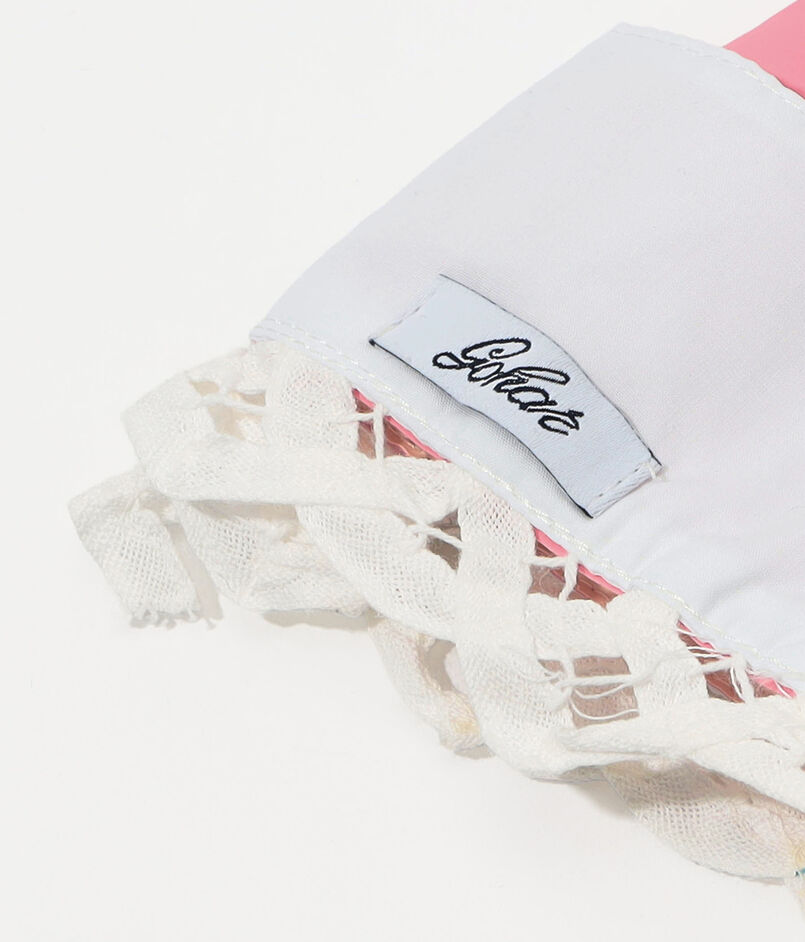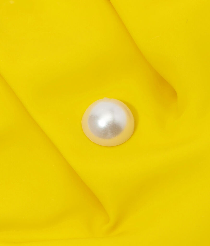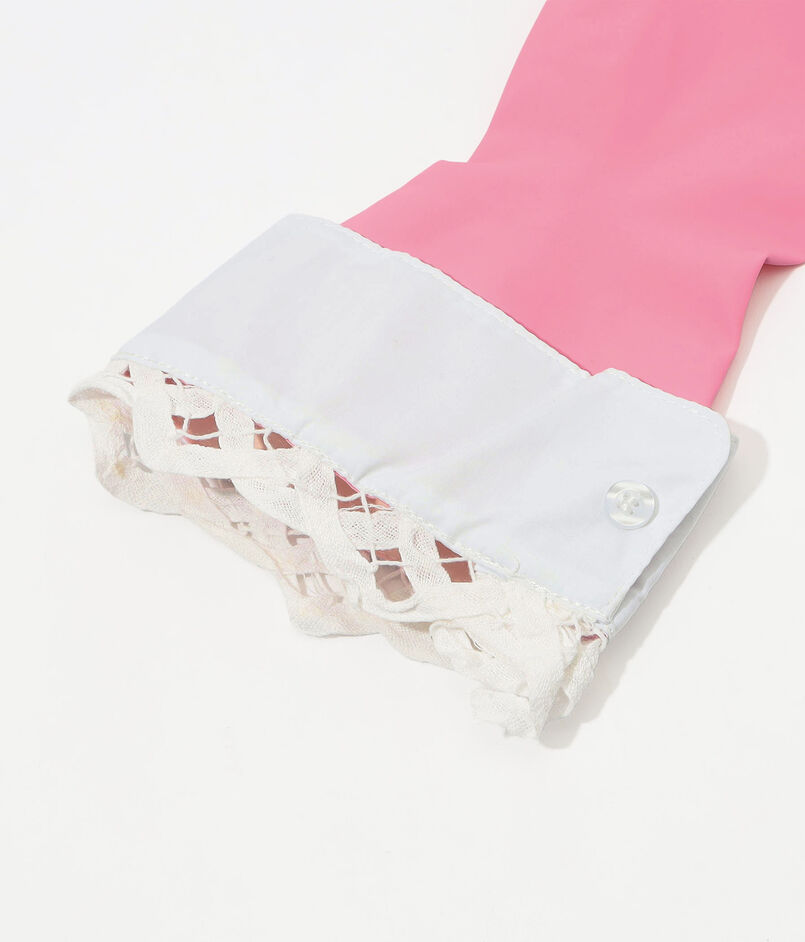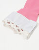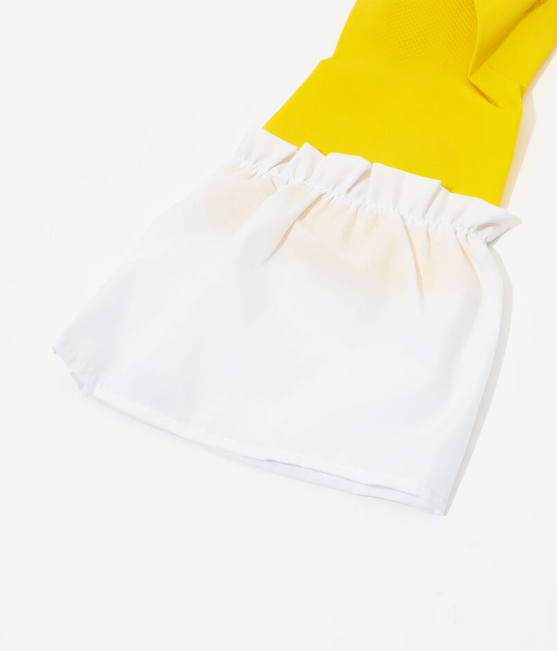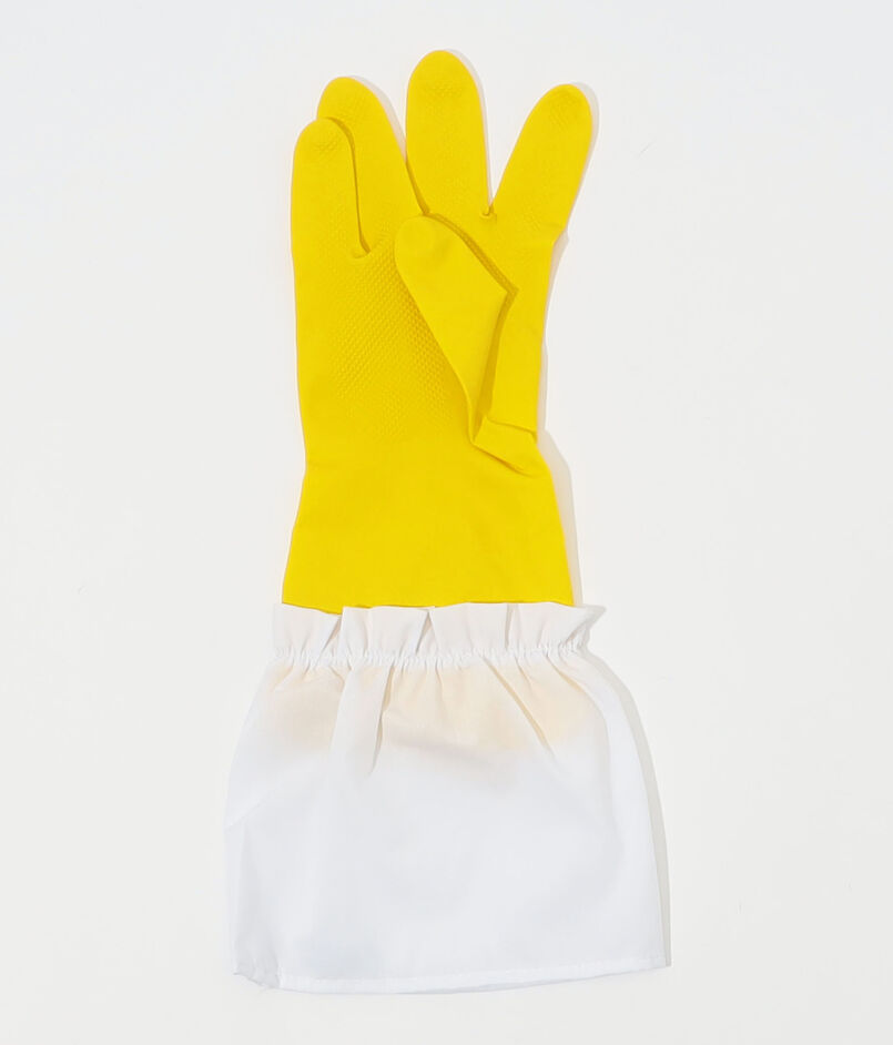 白いバッテンバーグレースの縁取りと指にパールの装飾が施された、ゴム製のホストグローブ。