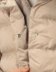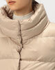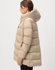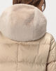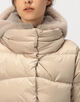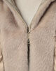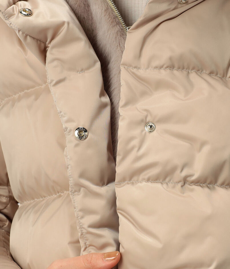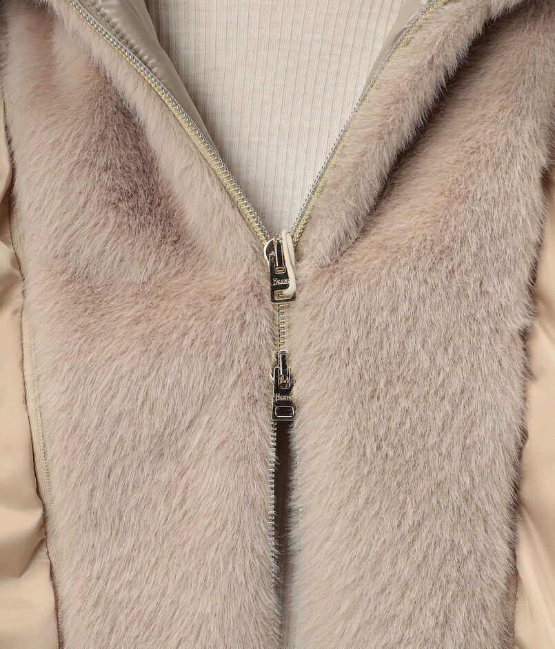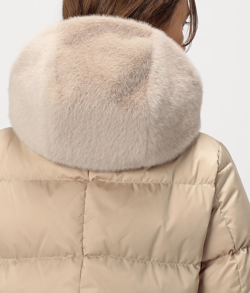 襟にはファブリックと同系色のエコファーをあしらい、エレガントな印象に仕上げています。