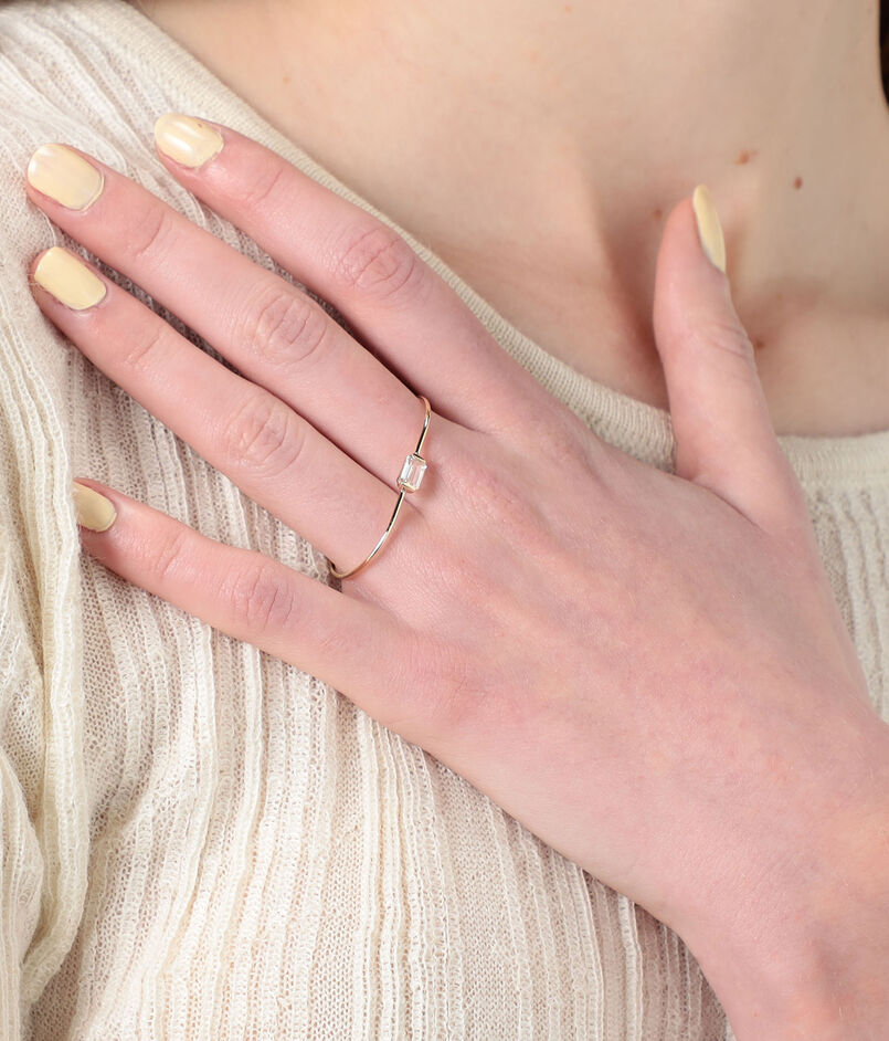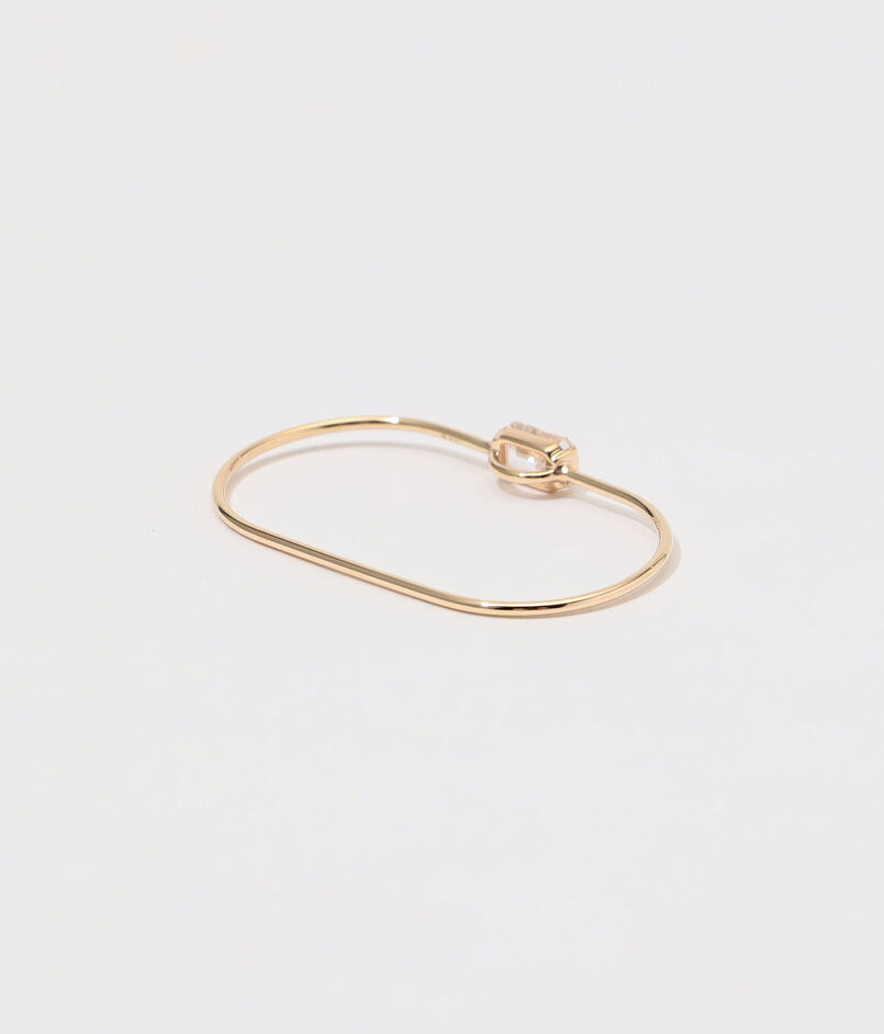 二本の指を通して着用するデザインは、ジュエリーそのものをアートピースのように感じさせ、シンプルな装いにもモードなニュアンスをプラス。