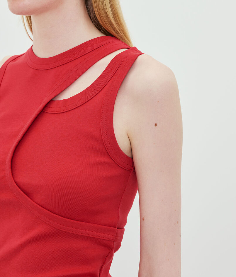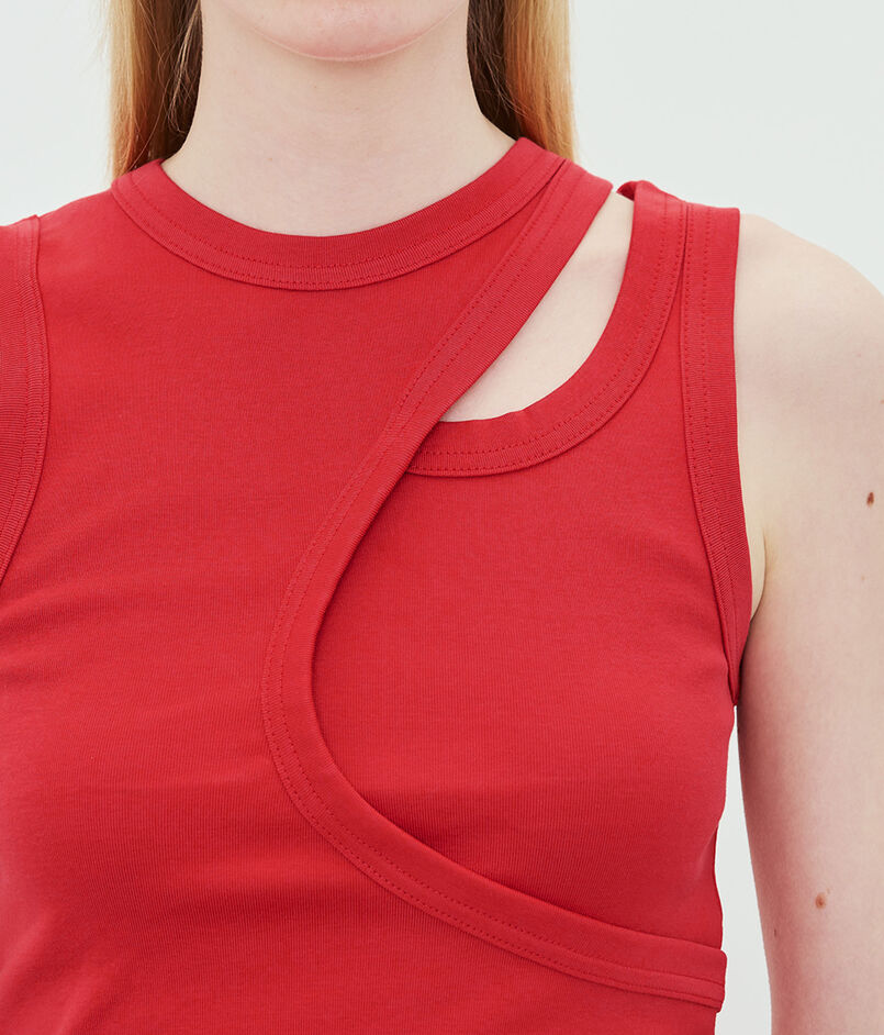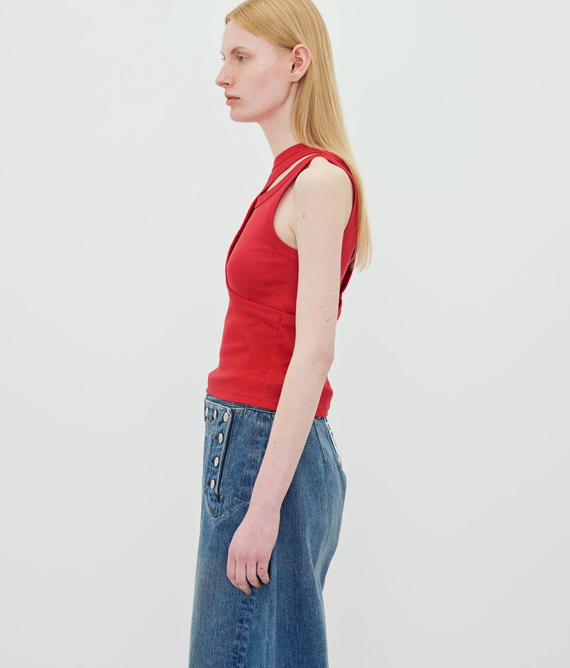 無駄を削ぎ落としつつもカットの異なるタンクトップを重ねたような構築的なデザインが、纏うだけで装いにモダンなエッジと立体感を与えます。