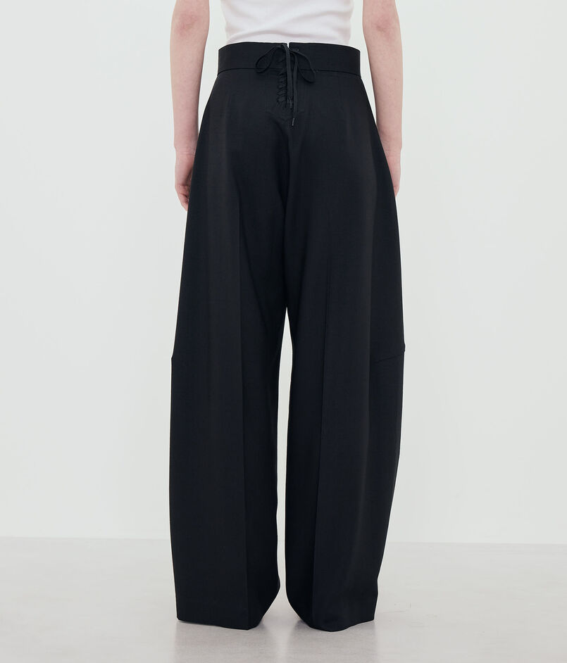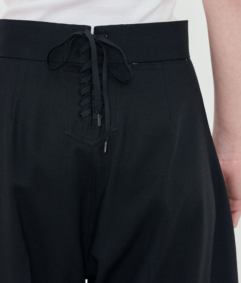 フロントにはセーラーパンツの顔となるボタンデザインを、バックスタイルにはレースアップを配した高いデザイン性を有し、コンパクトな腰回りから広がるほど良い丸みを帯びたバレルシルエットで、360度どこから見ても美しいフォルムを実現しています。