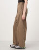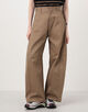 ウエスト周りはミニマルですっきりとした設計で、ひざ下にかけて広がるバレルレッグとのコントラストがモダンな印象。