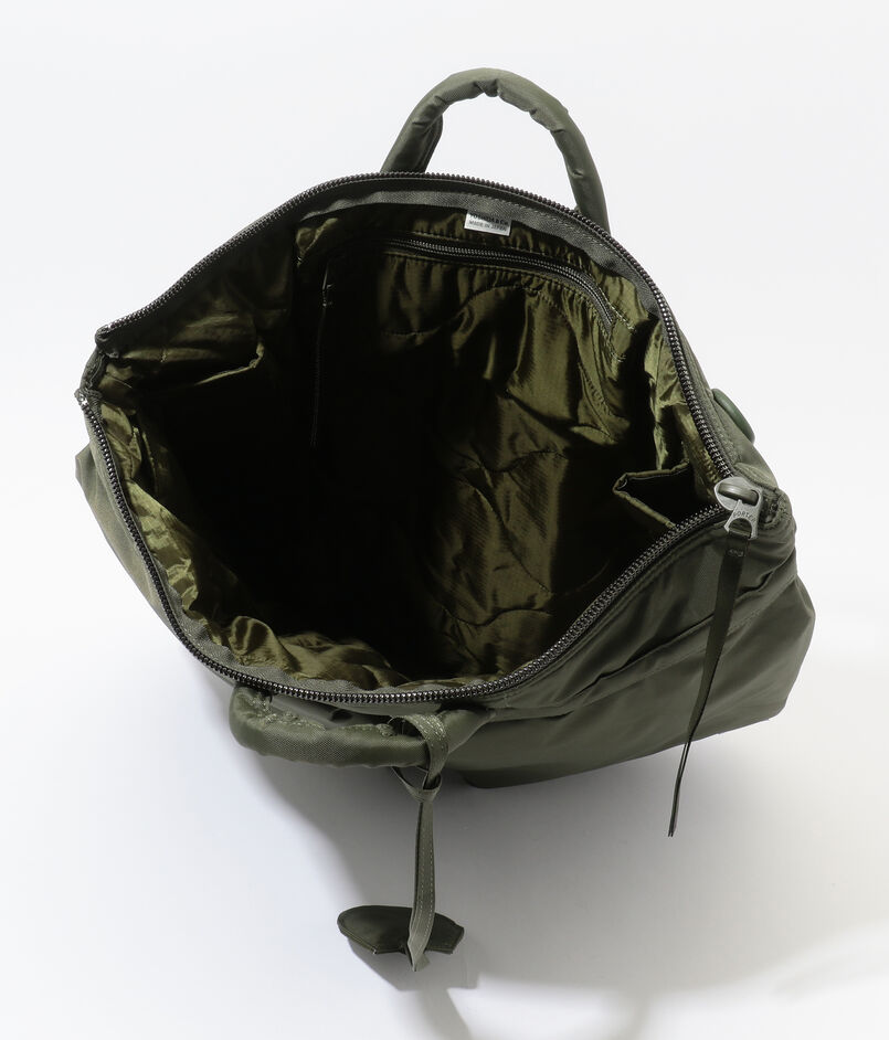 表地にtefox(テフロン加工を施した撥水性に優れたナイロンオックス)、裏地にはオニオン柄のキルティングを使用しているコラボレーションバッグ。