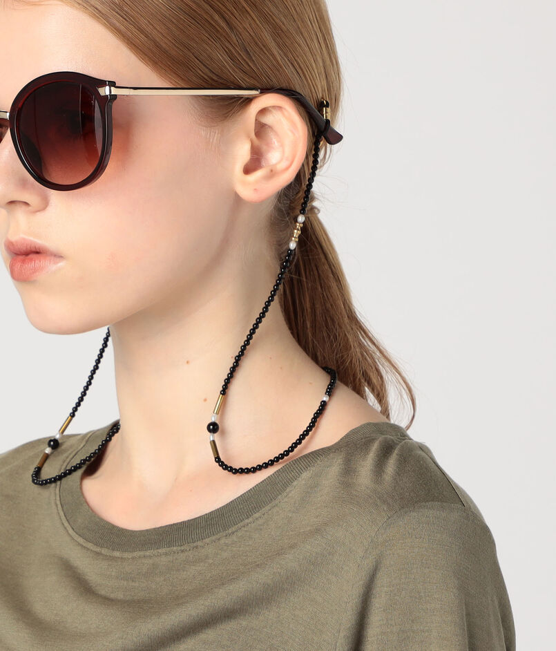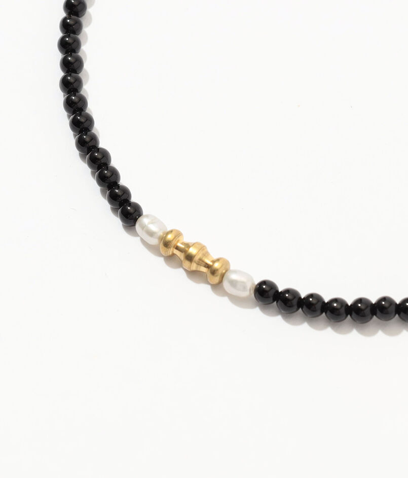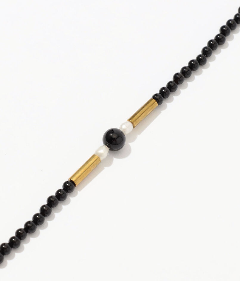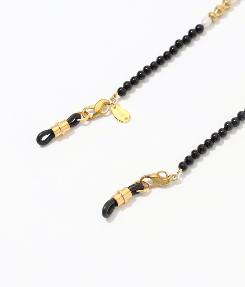 オニキスと淡水パール、ゴールドの粒子を規則的に並べ、大人っぽさを兼ね備えたグラスチェーン。