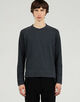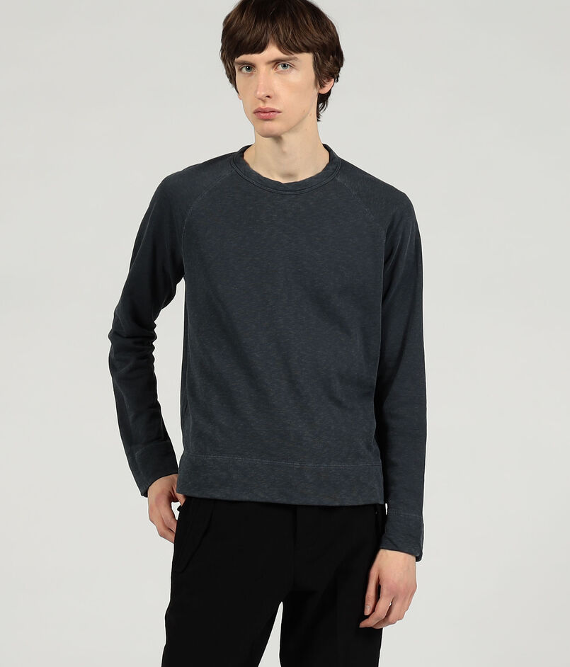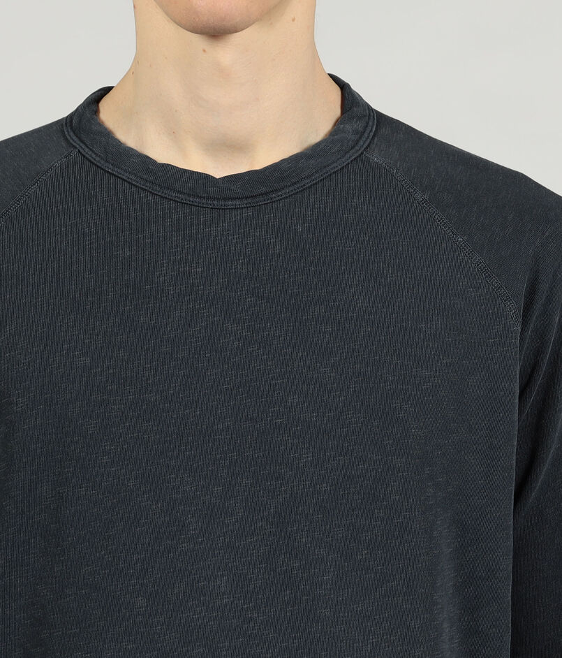 ゆったりとしたシルエットとラグランスリーブ、ほど良いあきのクルーネックでリラックスムード漂う一着。