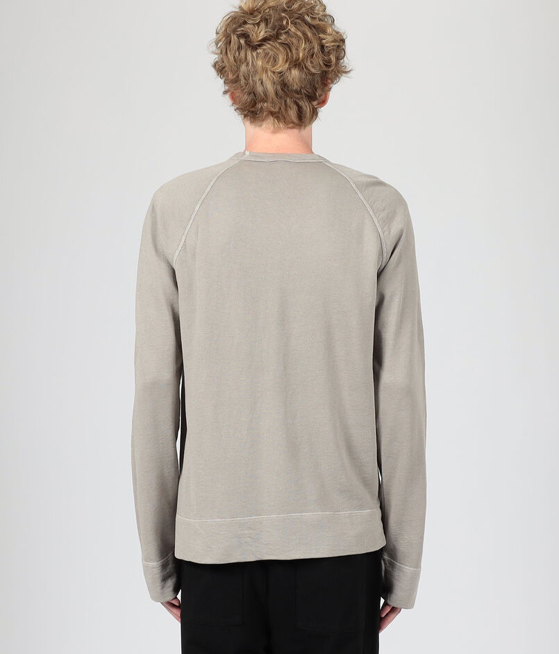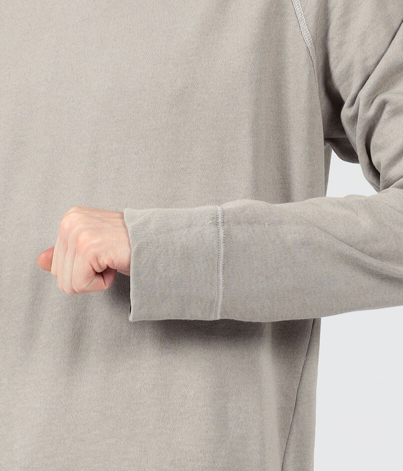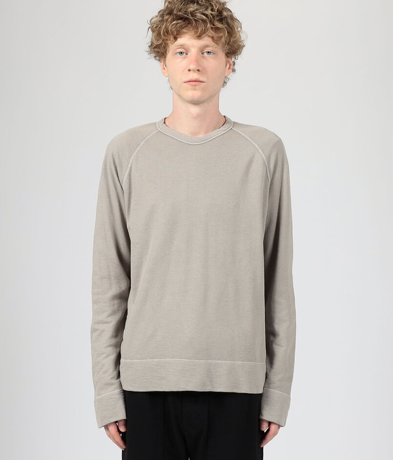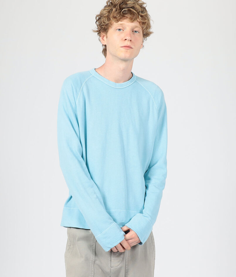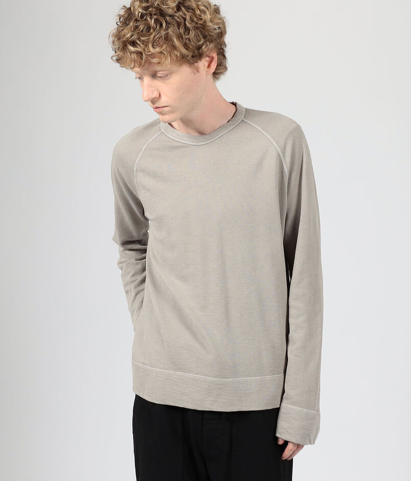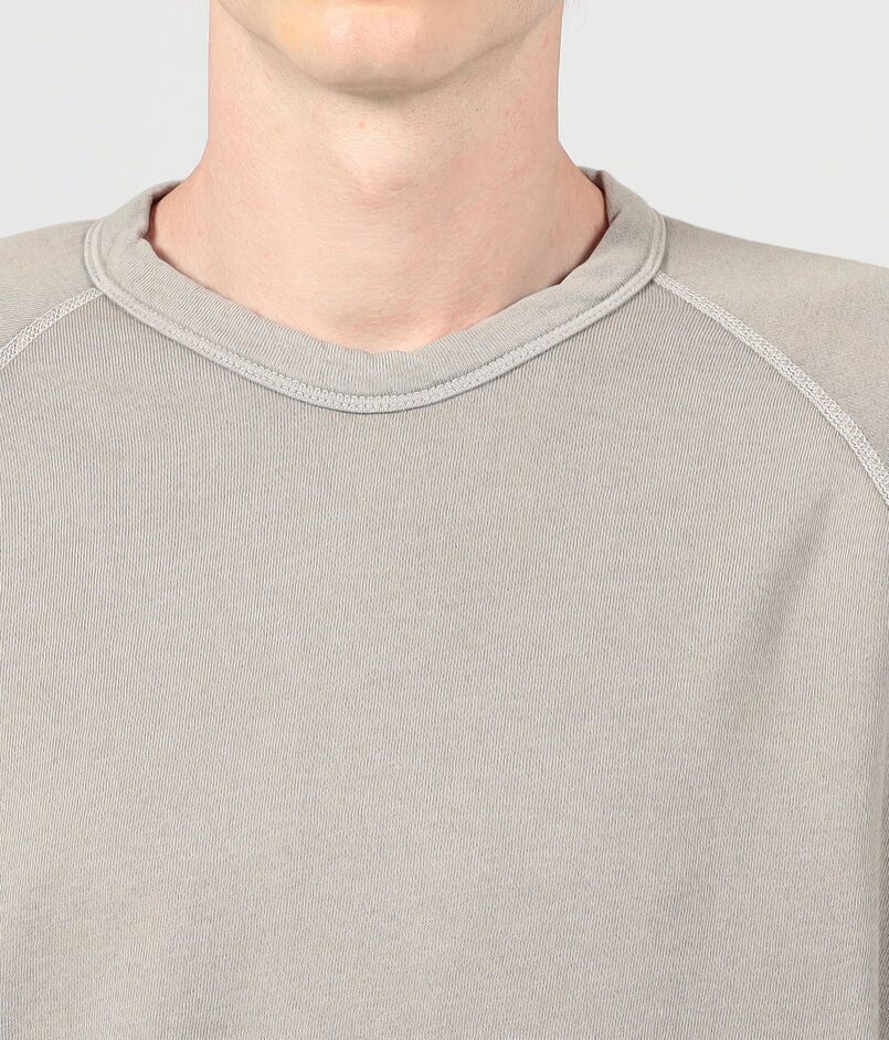 ゆったりとしたシルエットとラグランスリーブ、ほど良いあきのクルーネックでリラックスムード漂う一着。