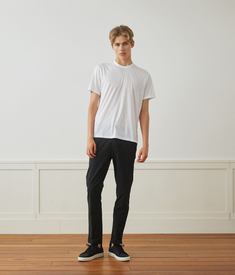 伸縮性に優れたコットンベースの素材を使用しているため、スポーツシーンでも活躍するアイテムです。