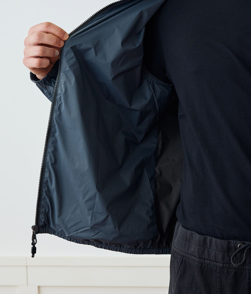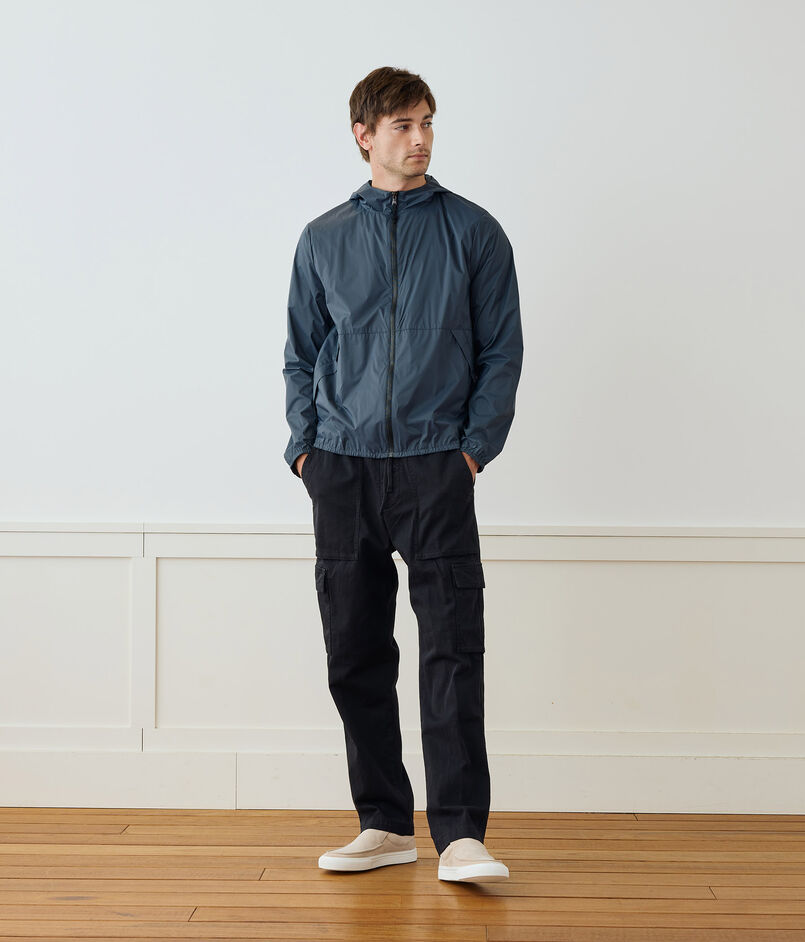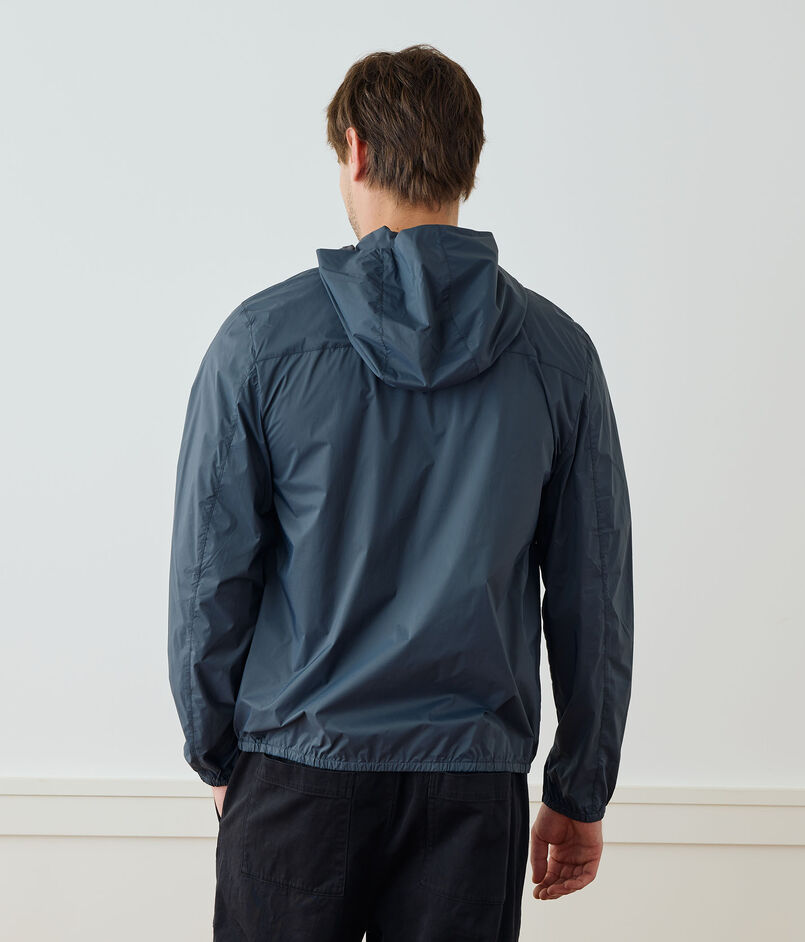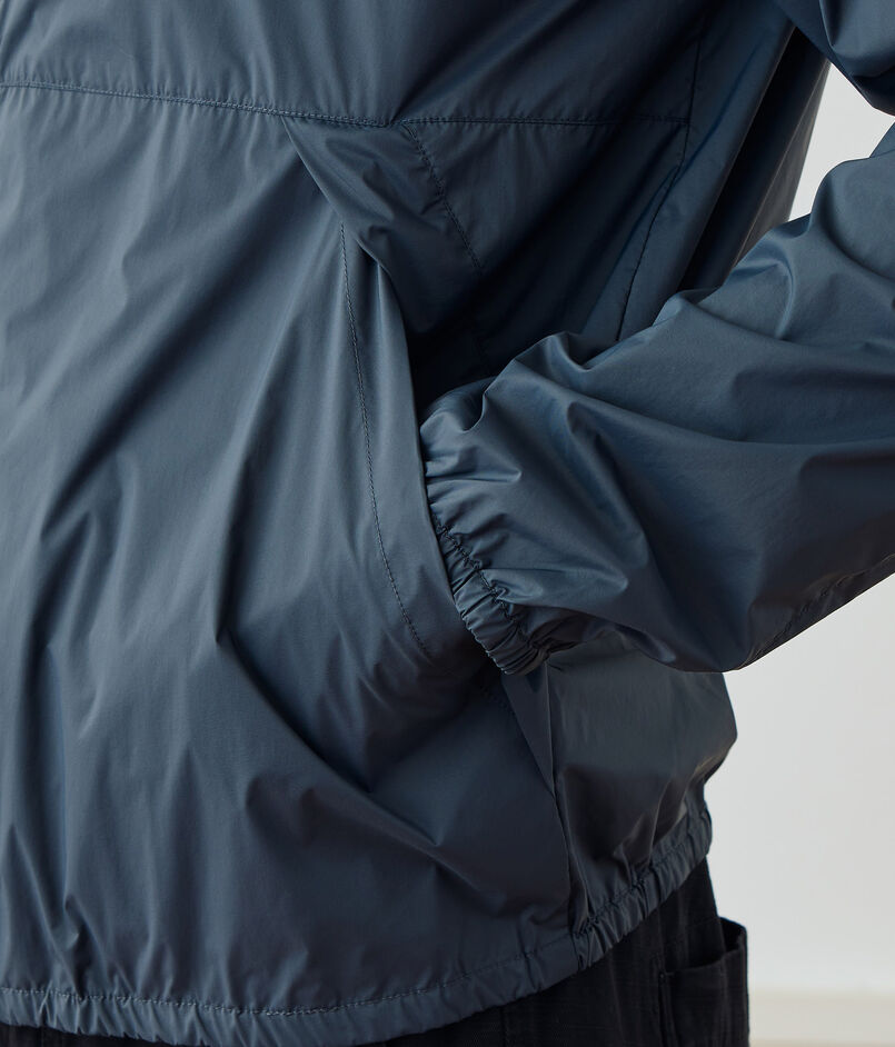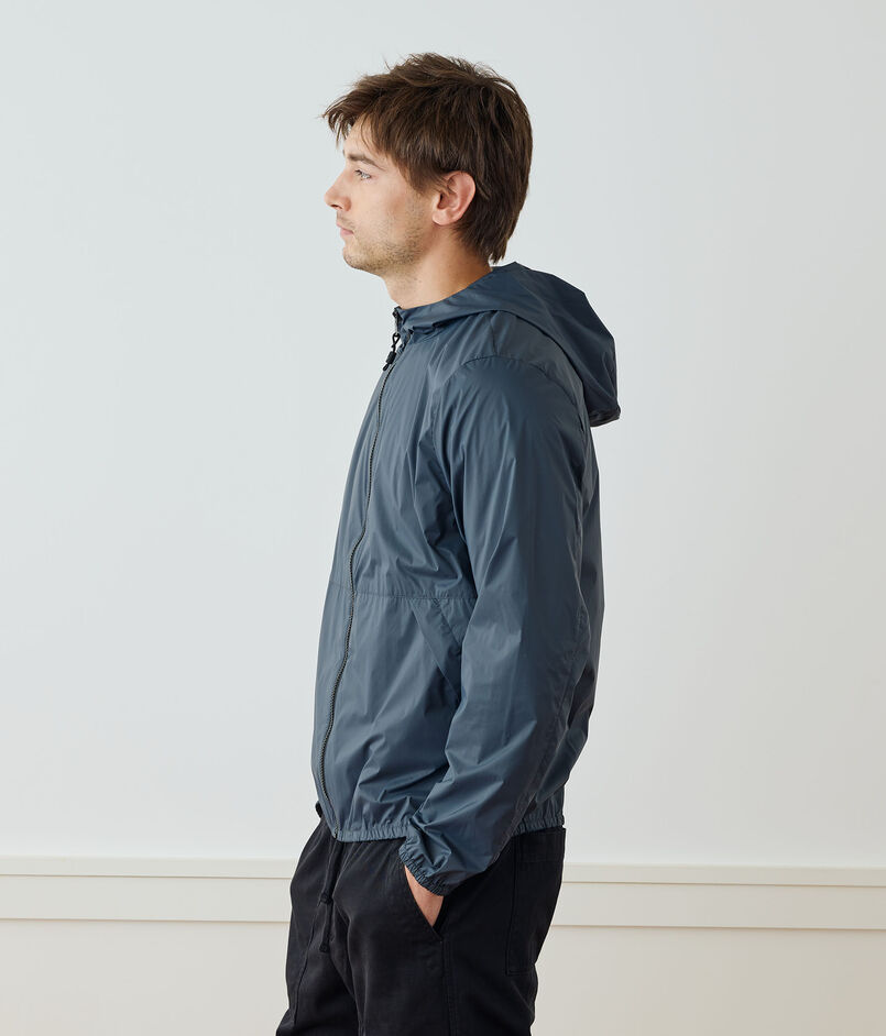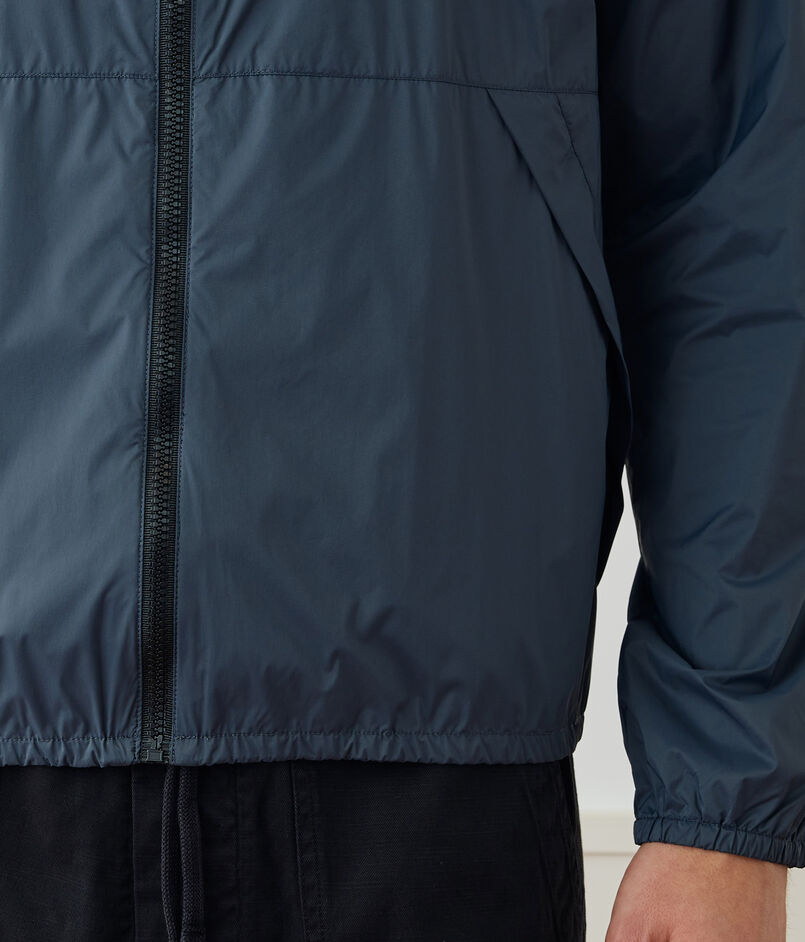 ソフトな撥水加工を施したナイロン製の軽量フード付きウインドブレーカー。