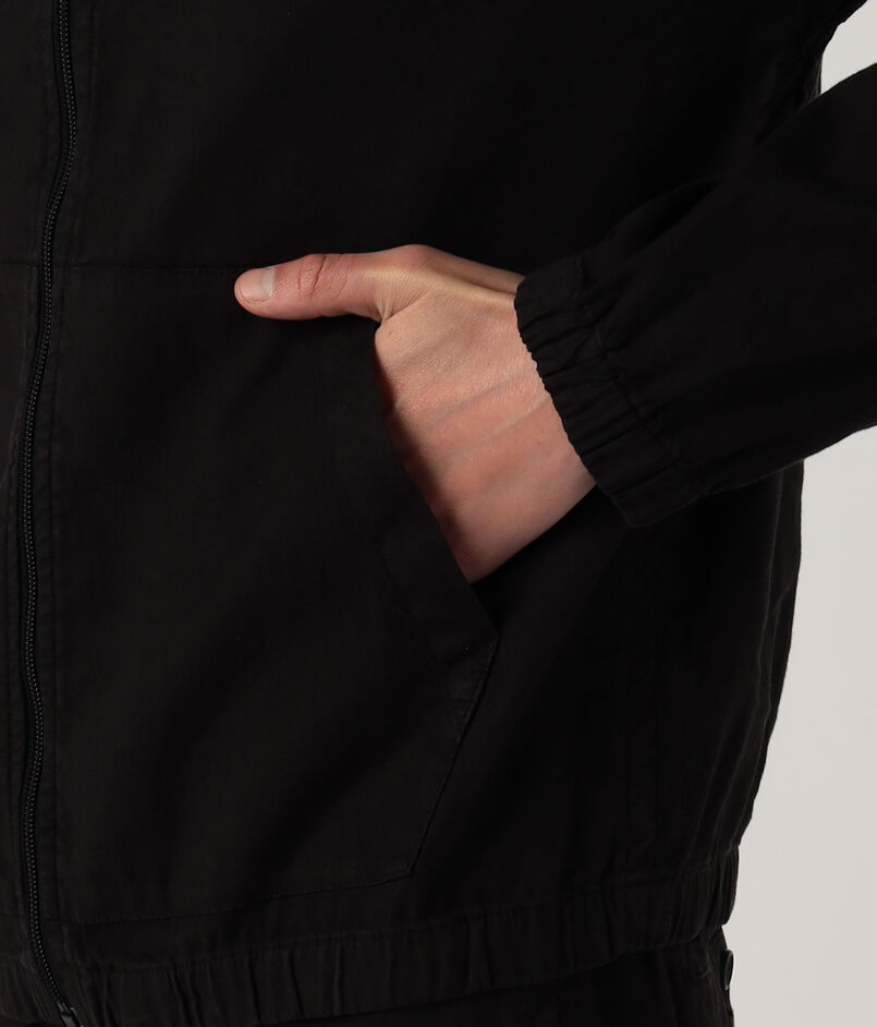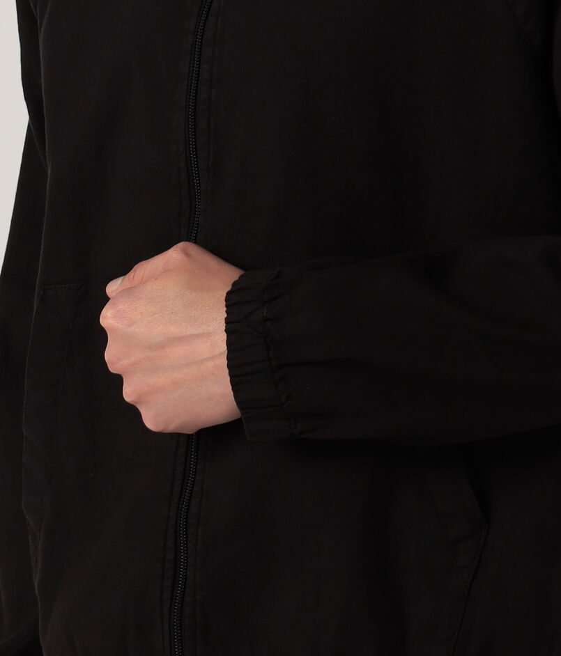 フロントのハンドポケットと伸縮性のある袖口と裾などこだわりのあるディテールがポイント。