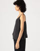 デコルテラインの絶妙なカッティングと前中心のスプリットヘムのディテールがポイント。