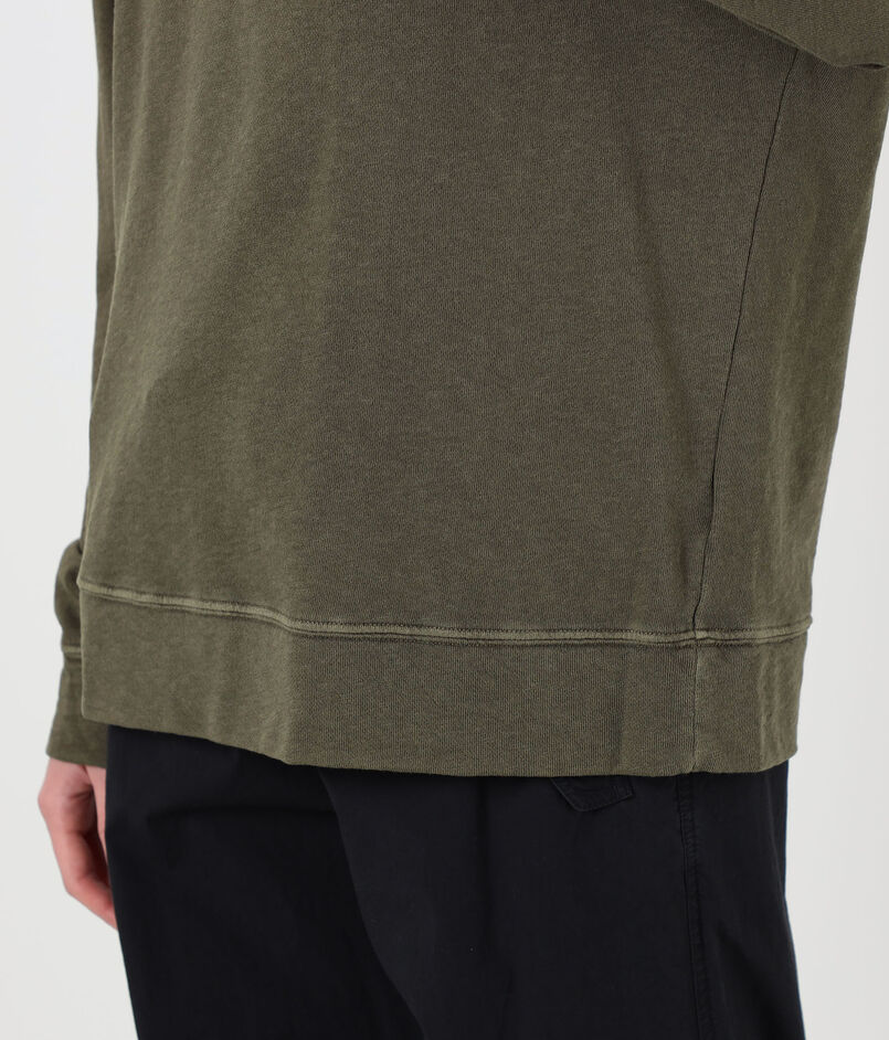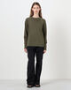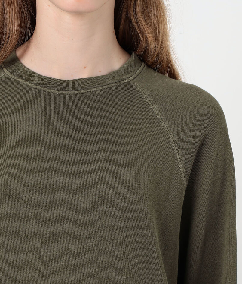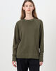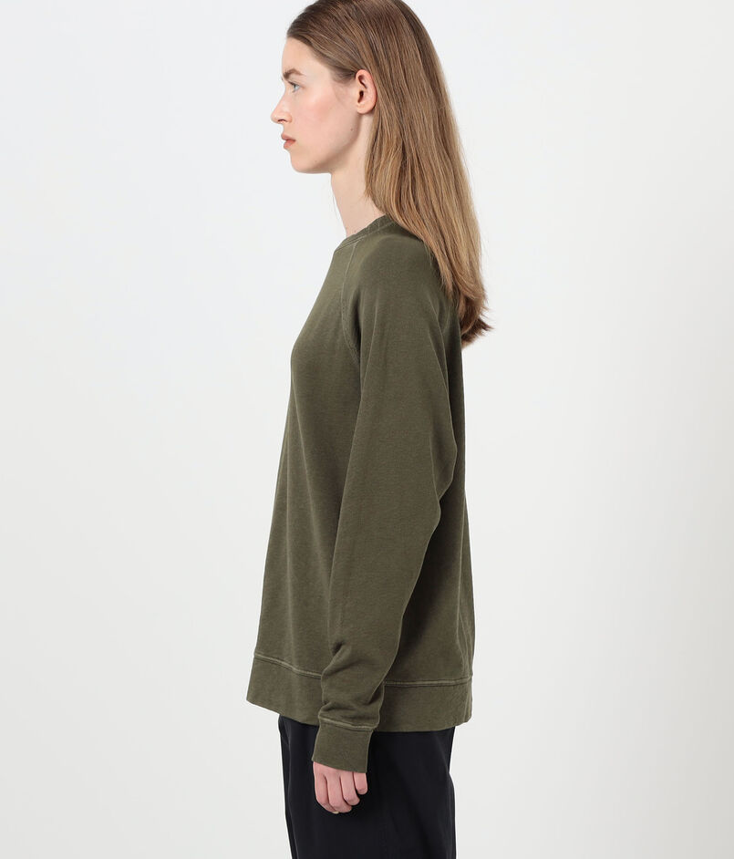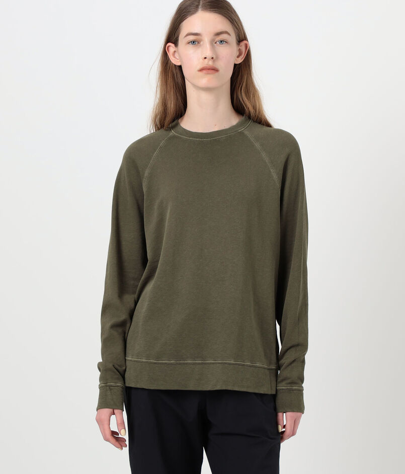 ゆったりとしたシルエットとラグランスリーブ、ほど良いあきのクルーネックでリラックスムード漂う一着。