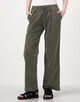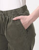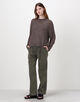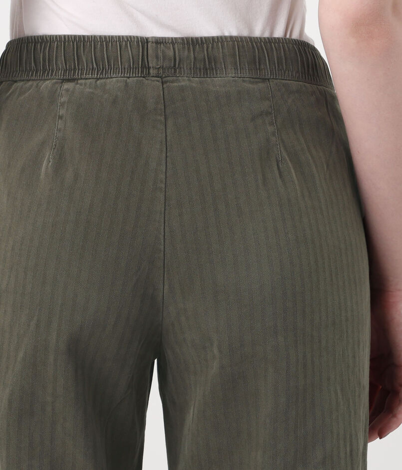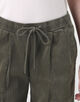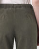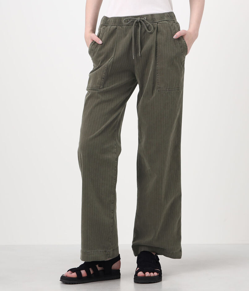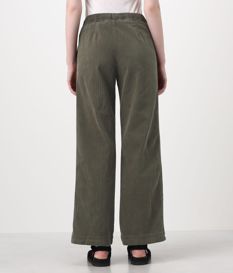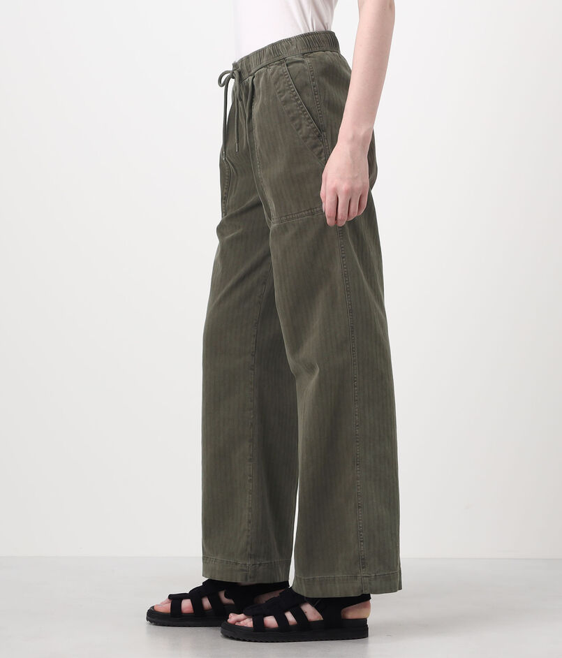 フロントのシングルプリーツとバックダーツがパンツに美しいシルエットを与え、共布のゴムウエストと同系色のドローコードがさりげない印象を与えます。