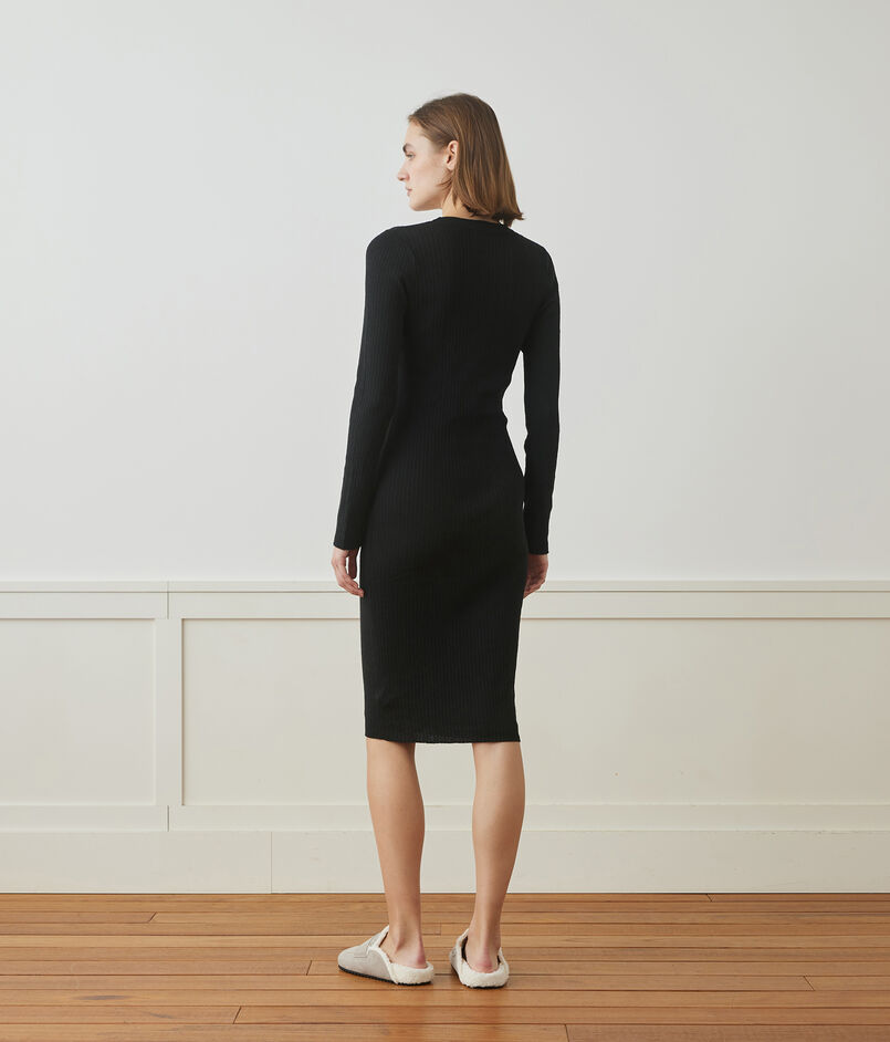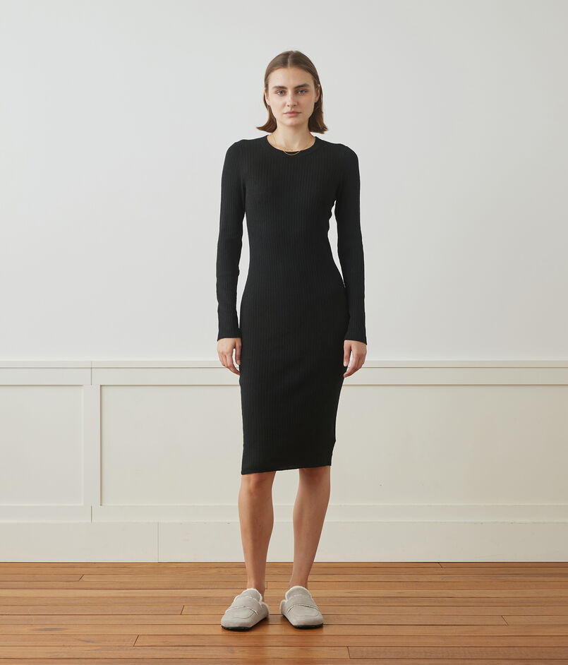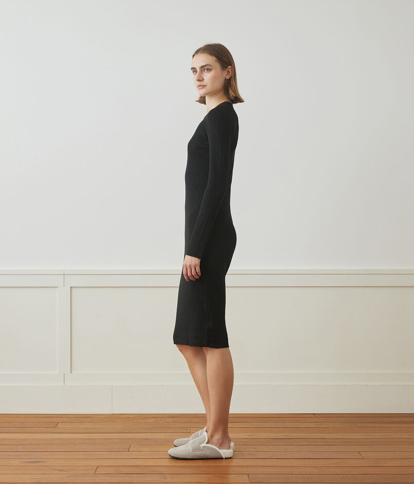 軽量のストレッチリネン糸でリブ組織に編み上げられたワンピース。