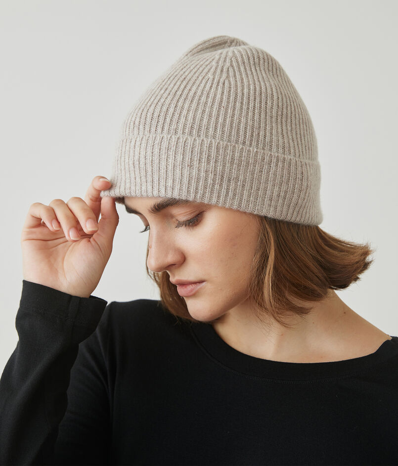 リサイクルカシミヤを使用したサーマル素材のビーニー。