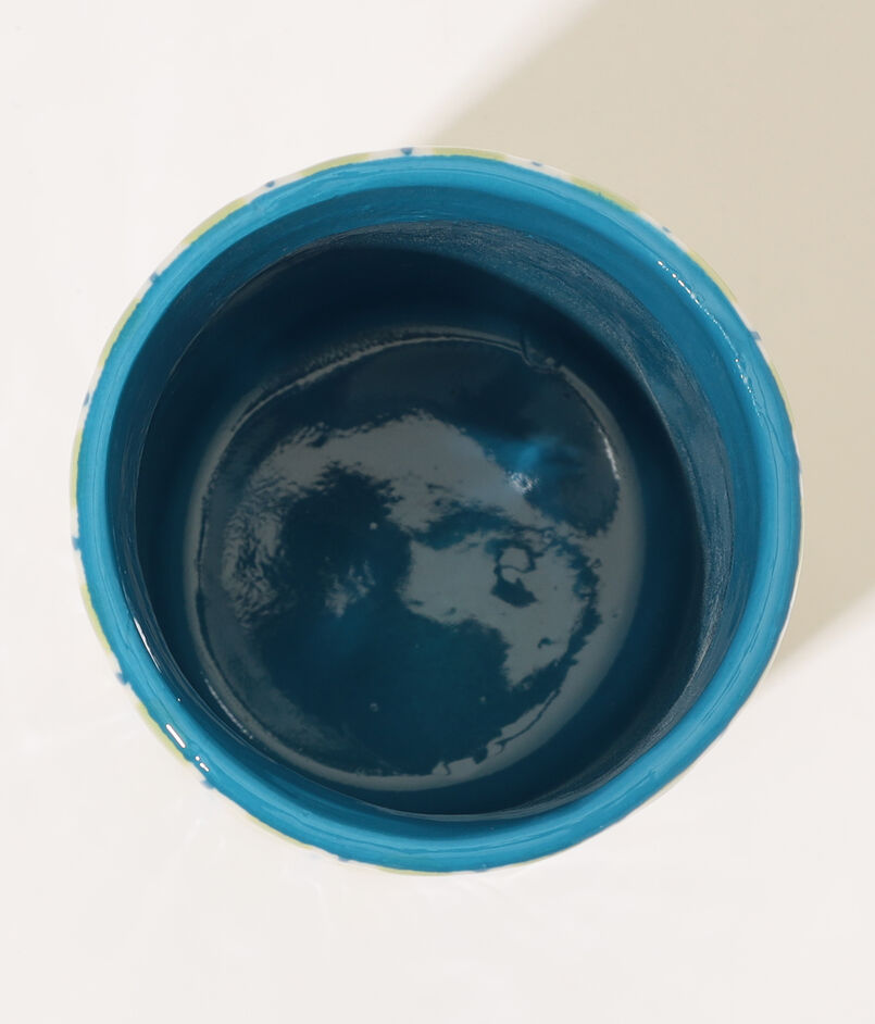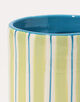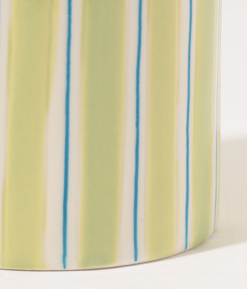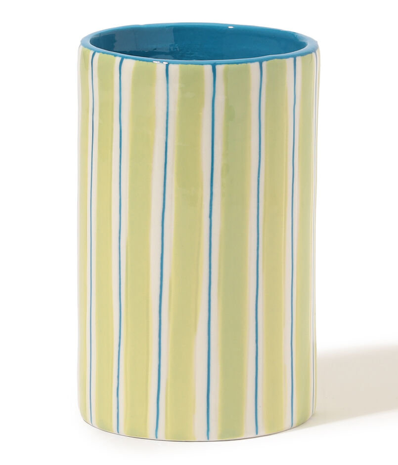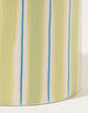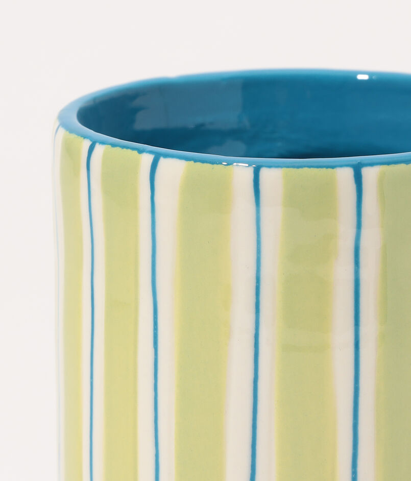 グリーンとブルーのストライプ柄が特徴的なこの花瓶は、どんなテーブルセッティングにもスタイリッシュなアクセントを添えます。