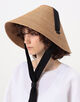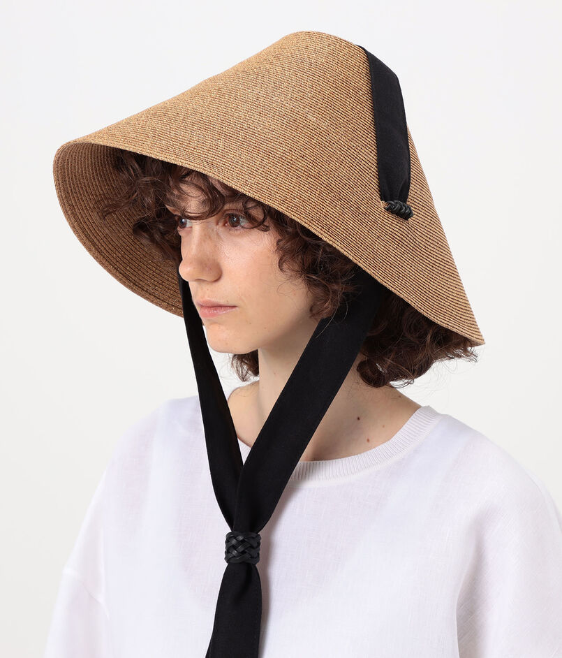 伝統的なバンブーハットをモチーフにした、幅広で円錐形の帽子。