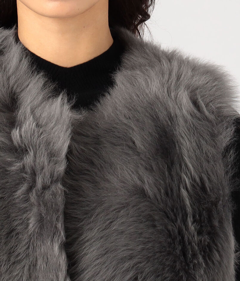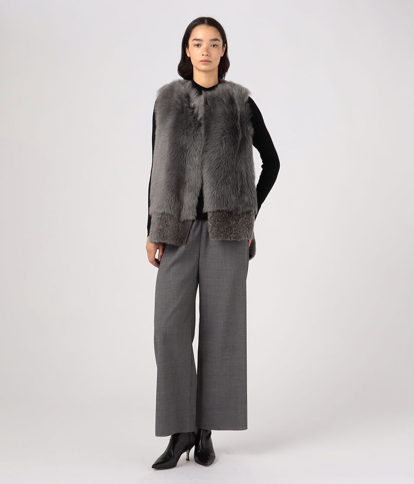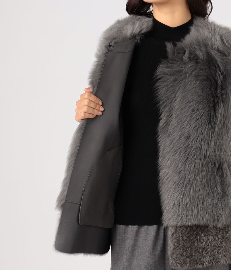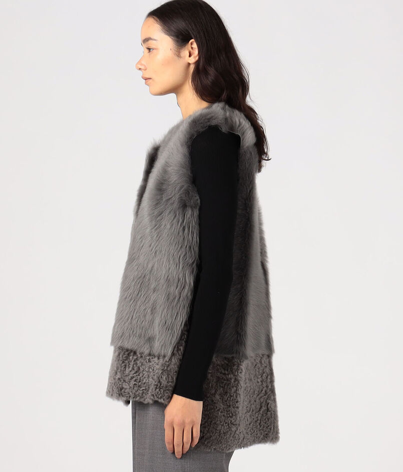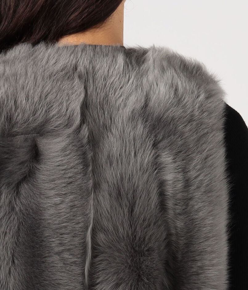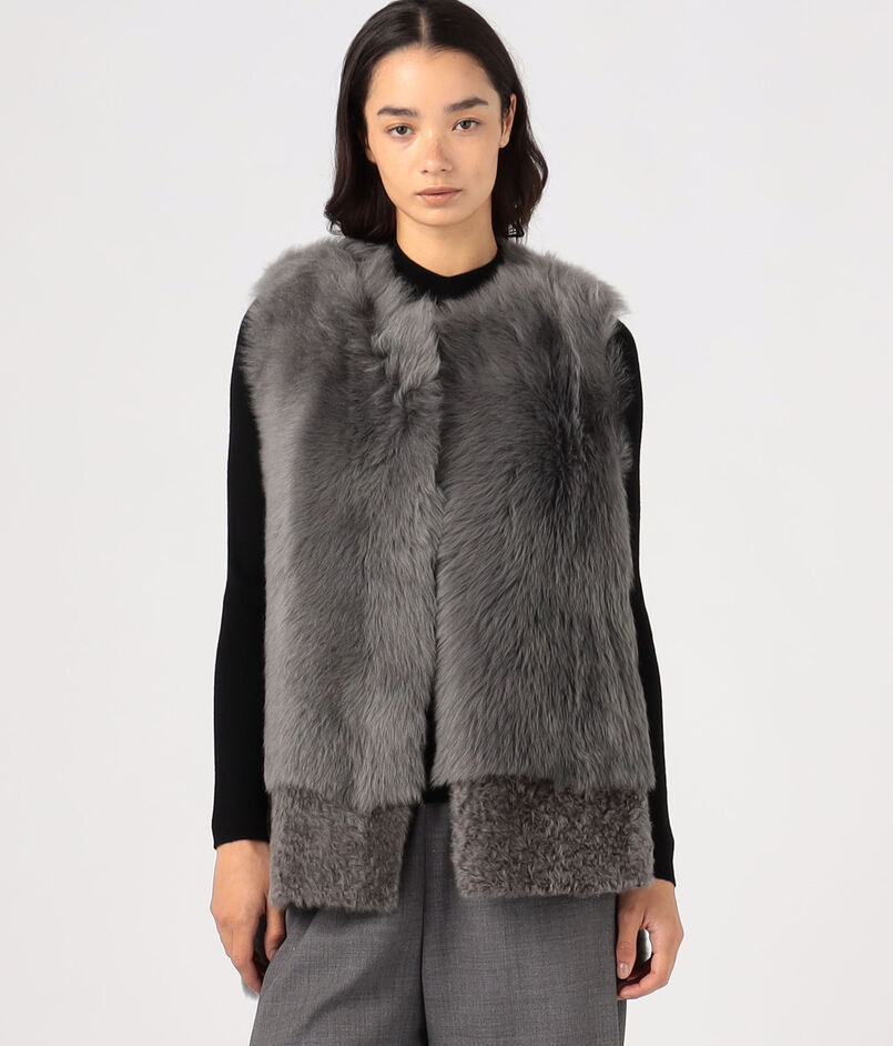 裾とサイドにフェザーシアリングがコントラストに配置された、〈KARL DONOGHUE〉で毎年人気のムートンジレ。