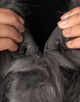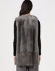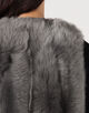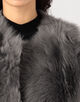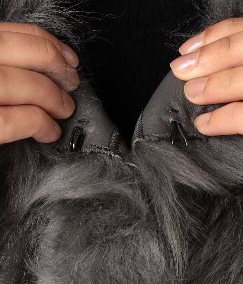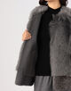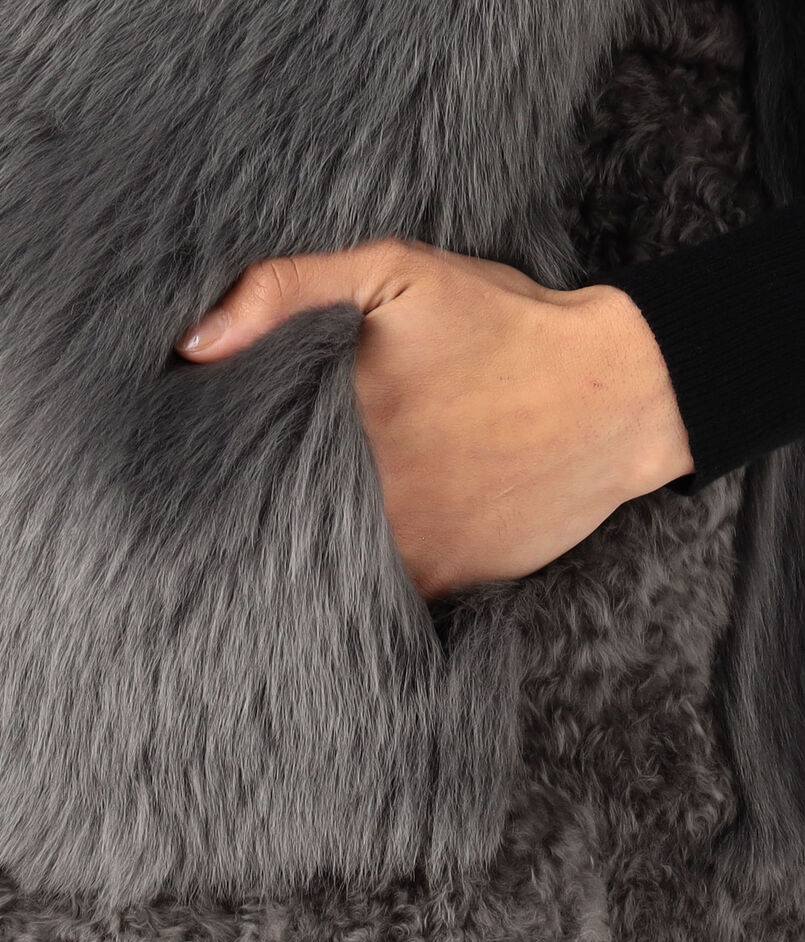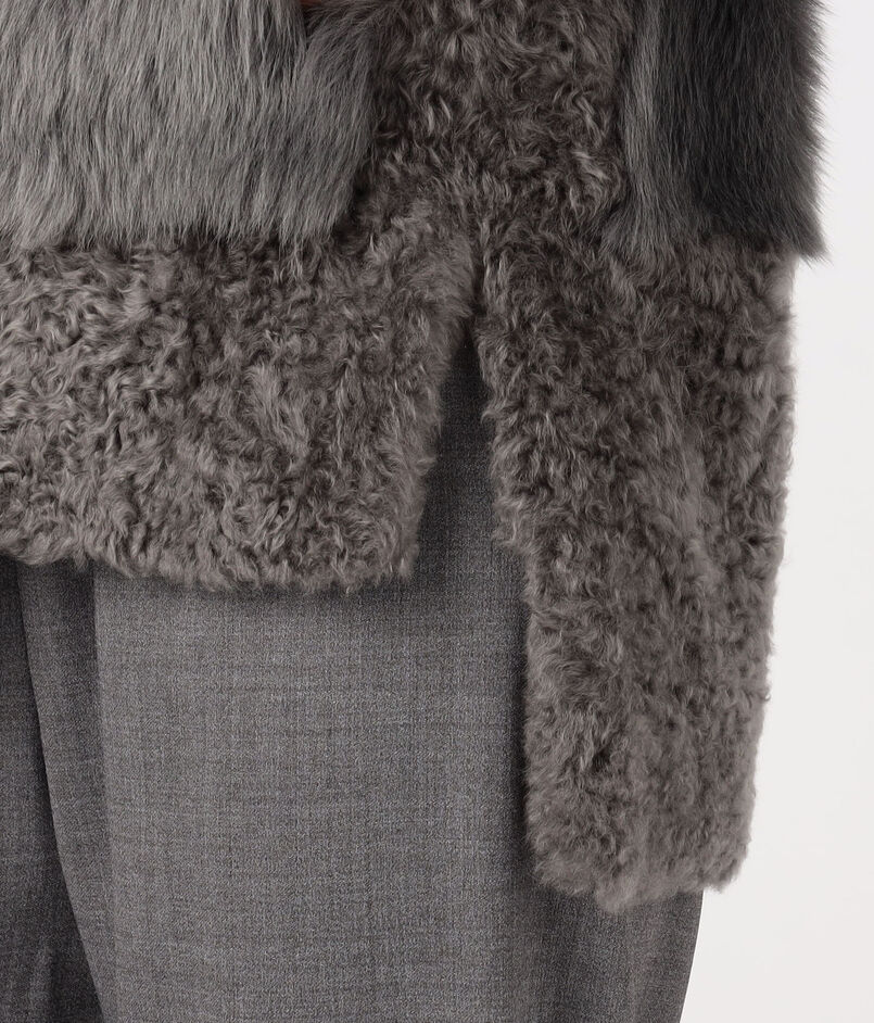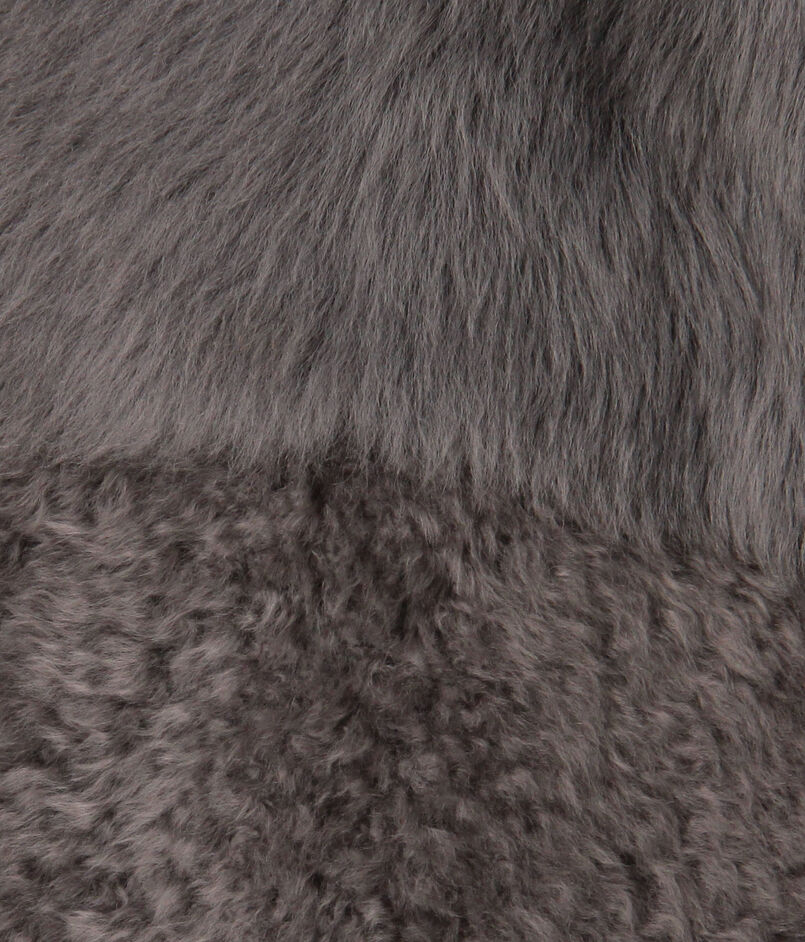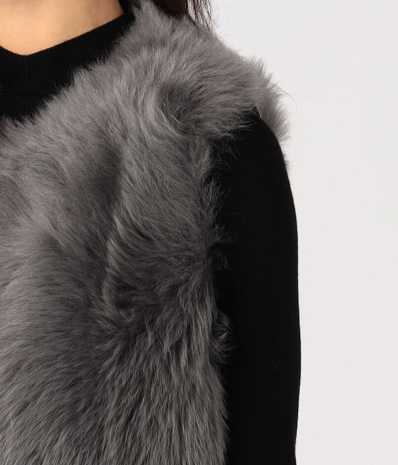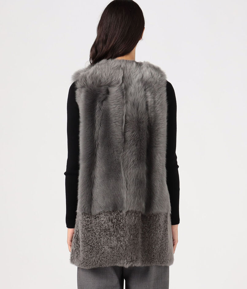 裾とサイドにフェザーシアリングがコントラストに配置された、〈KARL DONOGHUE〉で毎年人気のムートンジレ。