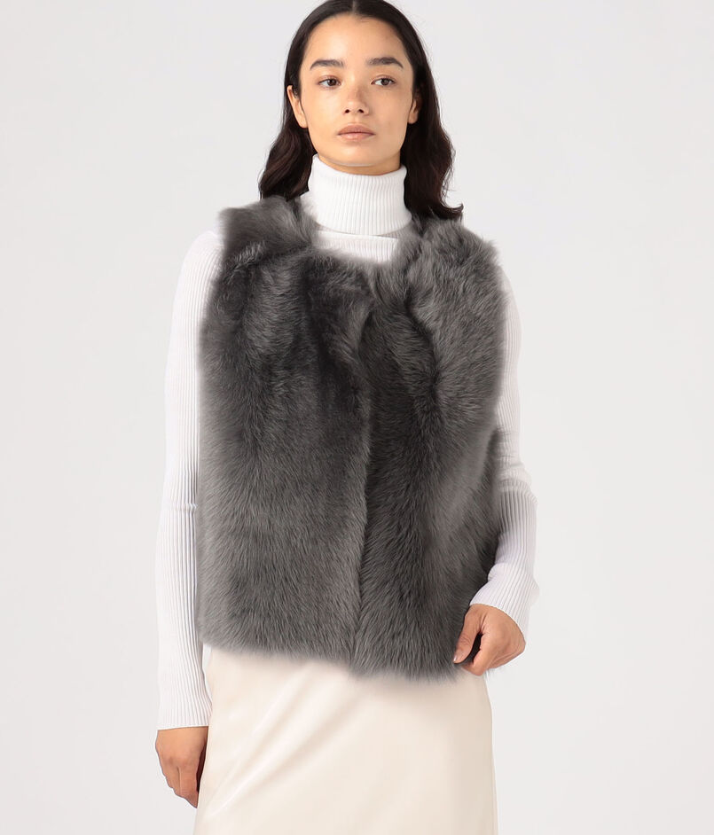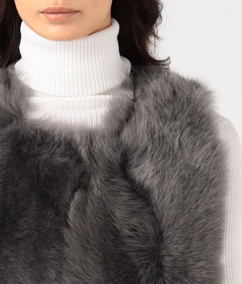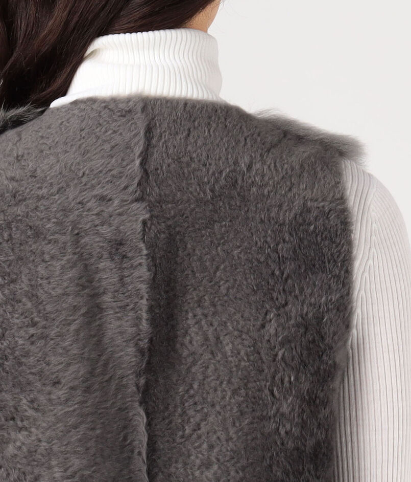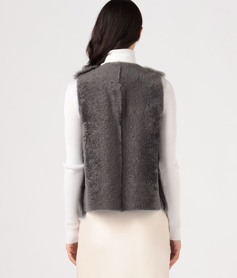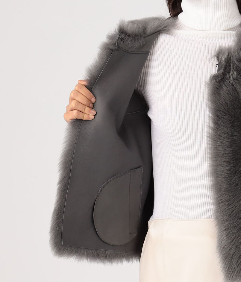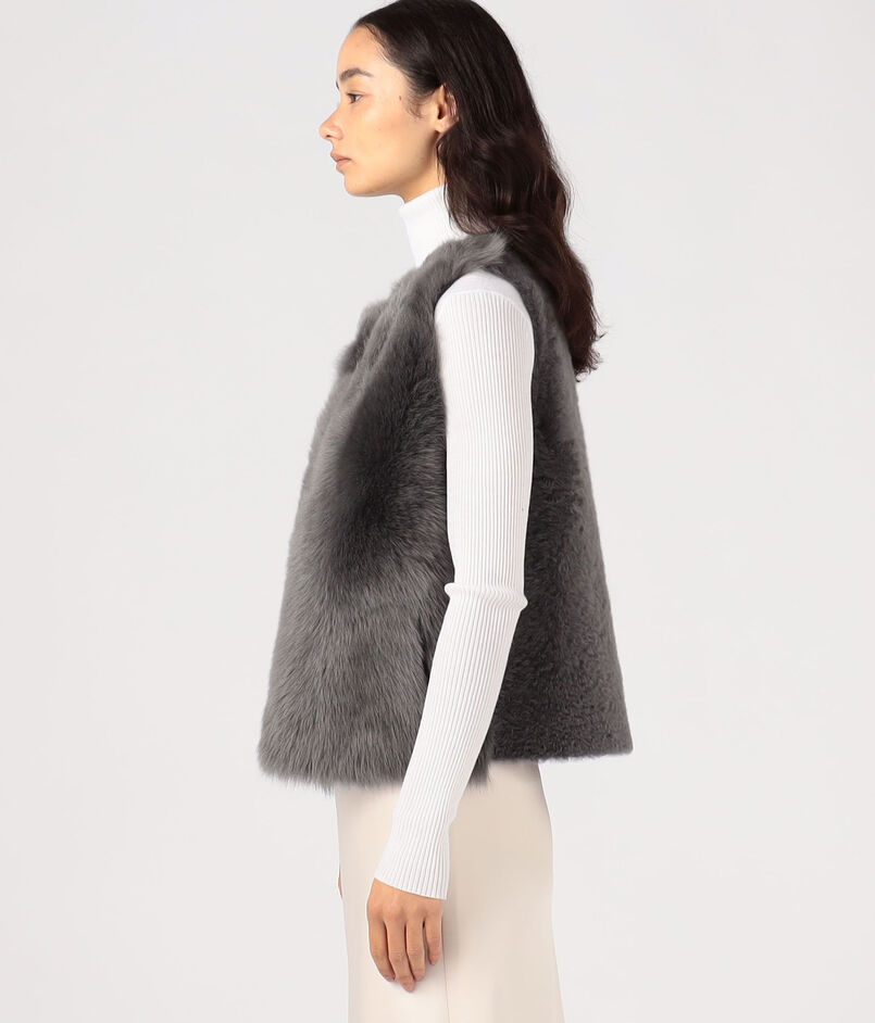 フロントは毛並みが長いトスカーナラムスキン、バックには対照的な毛並みが短いフェザー仕様のシンプルなジレ。