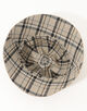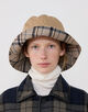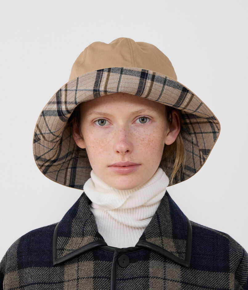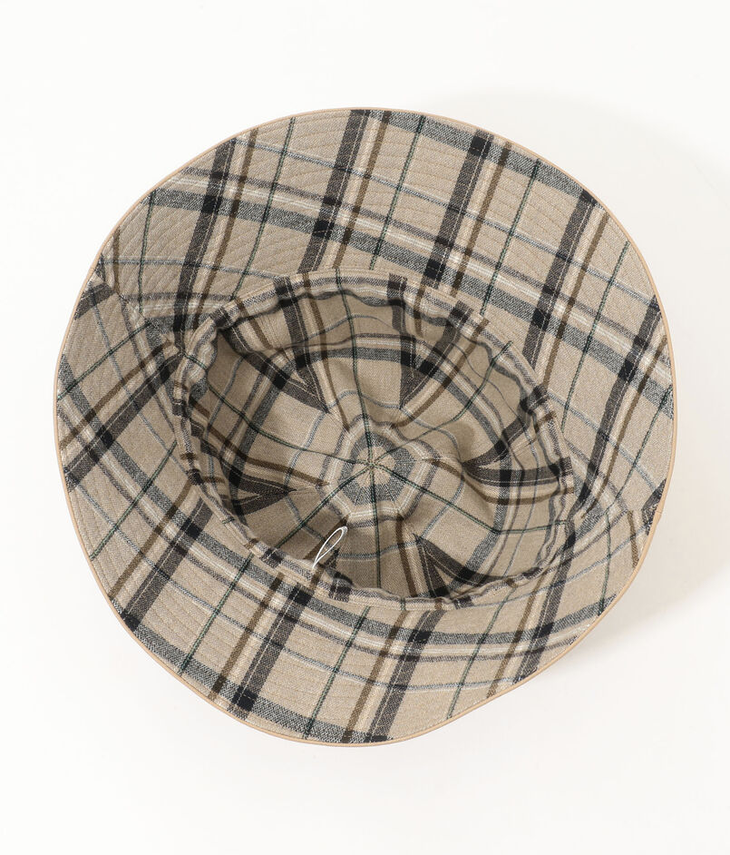 内側はベージュベースのチェック柄で、つばを追って柄を見せる着こなしもおすすめです。