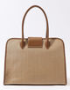 本体にフェード感あるラフィア調素材、付属類にボックスカーフ調皮革を使用したワイドストラップがアクセントとなるA4サイズ資料等収納可能な2way(手持ち・着脱式ショルダーベルト)ボストンバック。