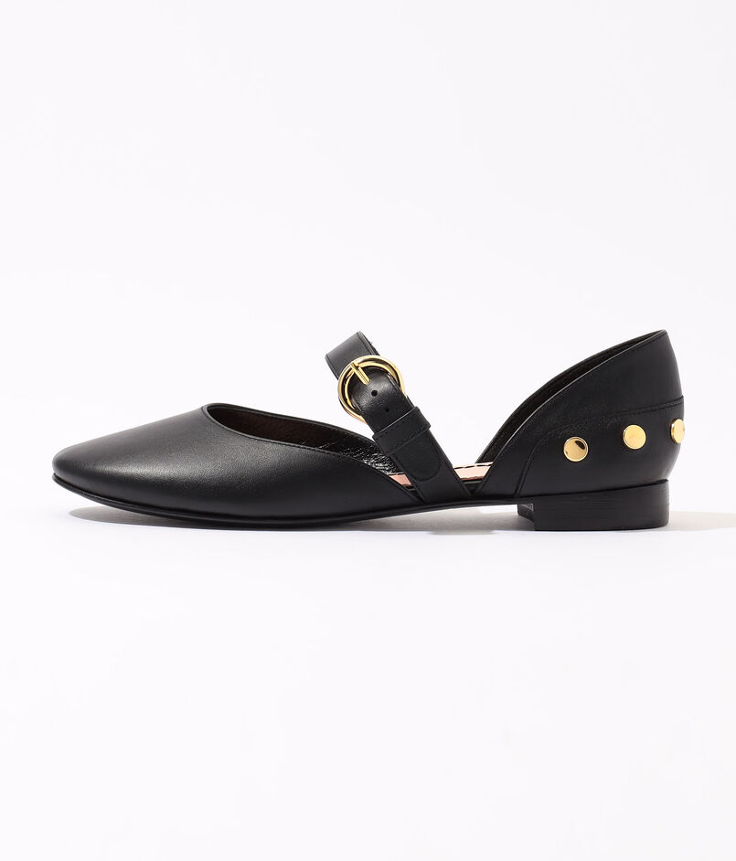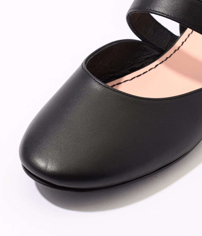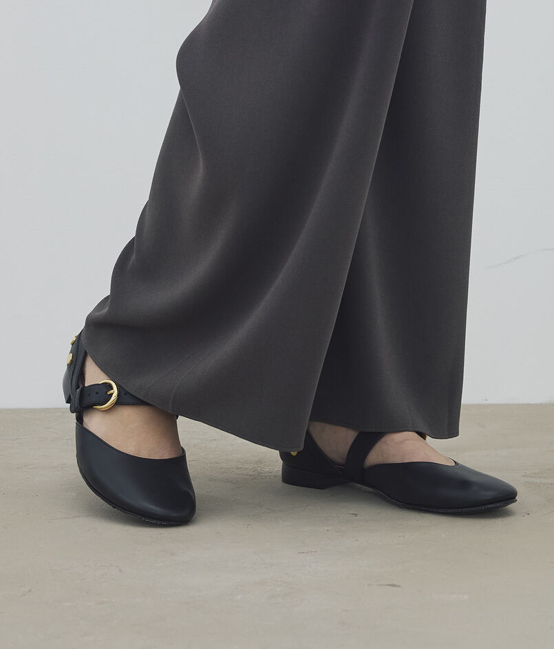 ラウンドしたカッティングが美しいストラップバレエハシューズ。