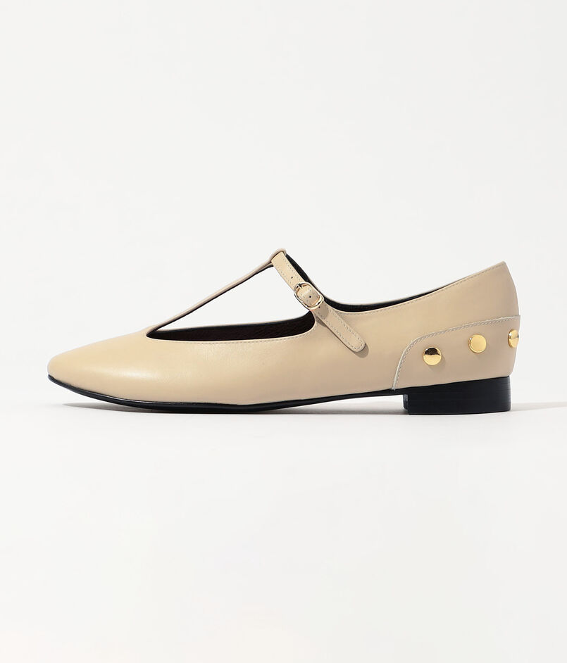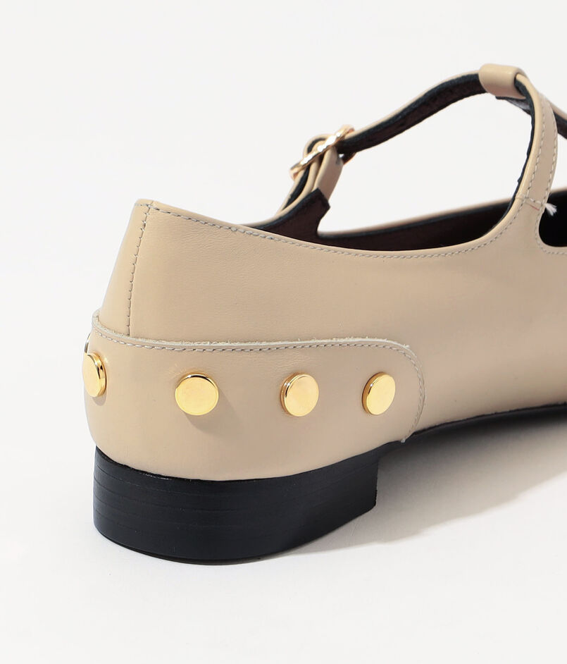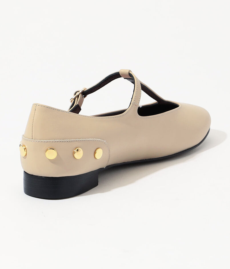バックにスタッズディテールを施したモードなTストラップのフラットシューズ。