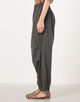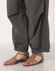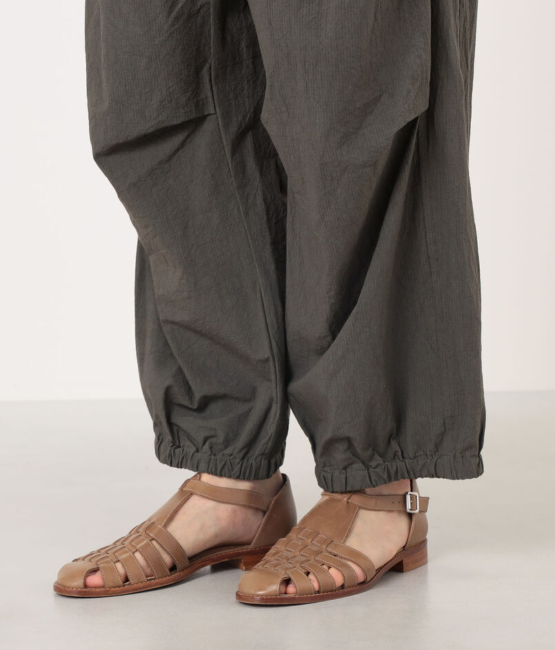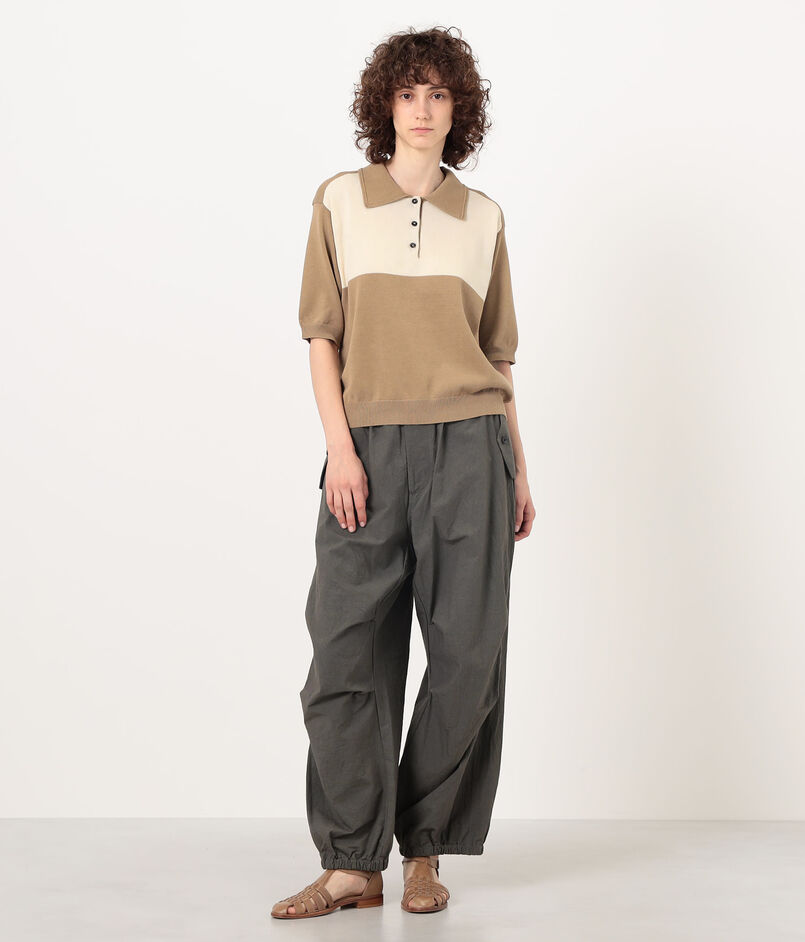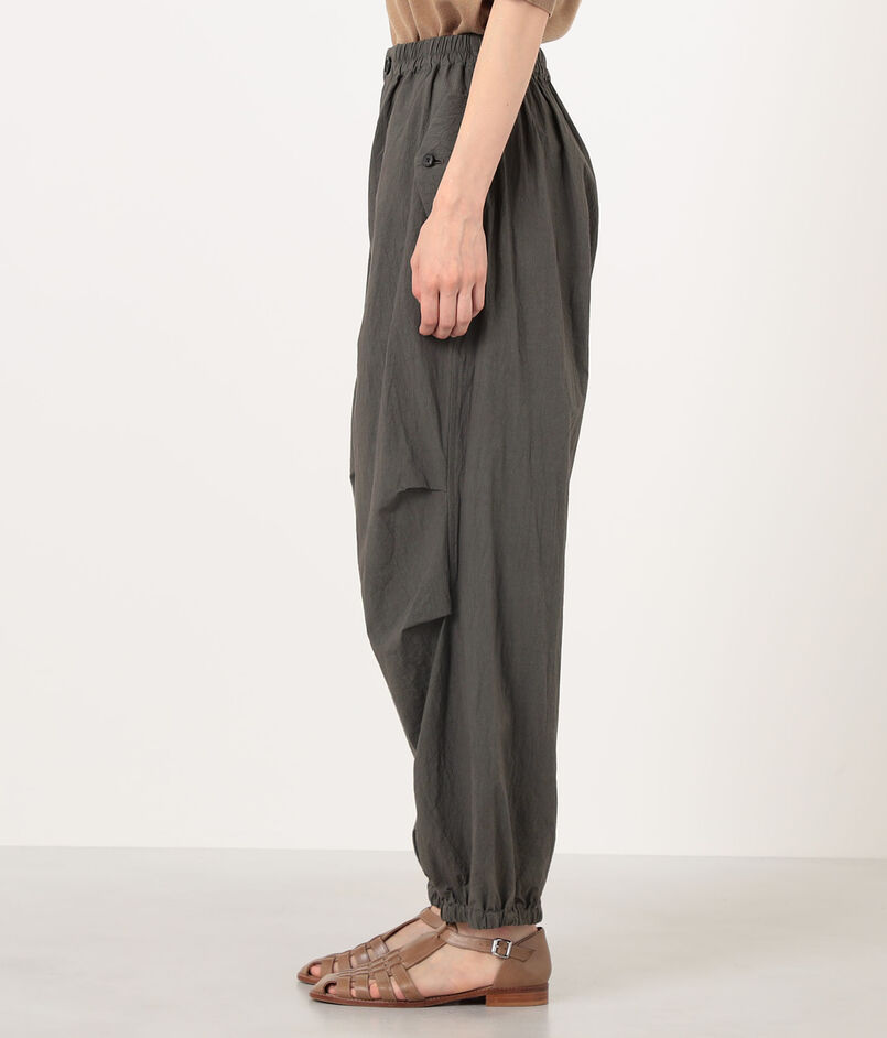カーゴパンツのように膝にタックが施されており、裾はゴムで軽く絞られているため、着用するとほど良いボリュームのあるシルエットが生まれます。