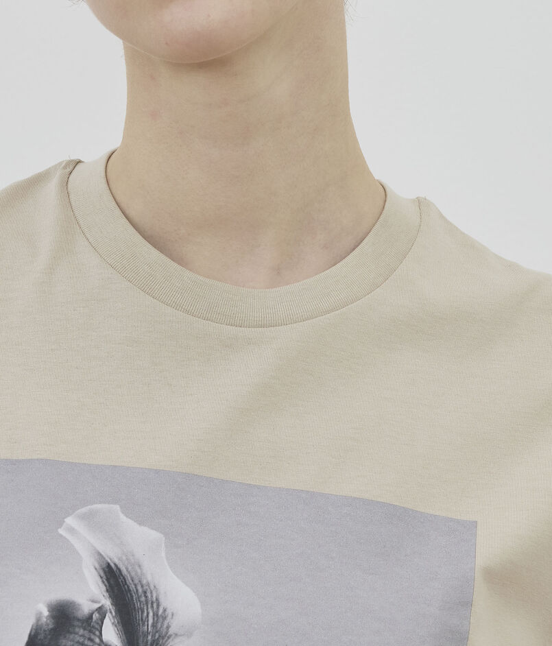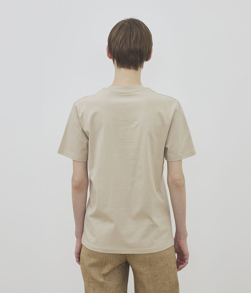 モノトーンな胸の絵柄をベージュ色のTシャツに載せて、柔らかさを表現しています。
