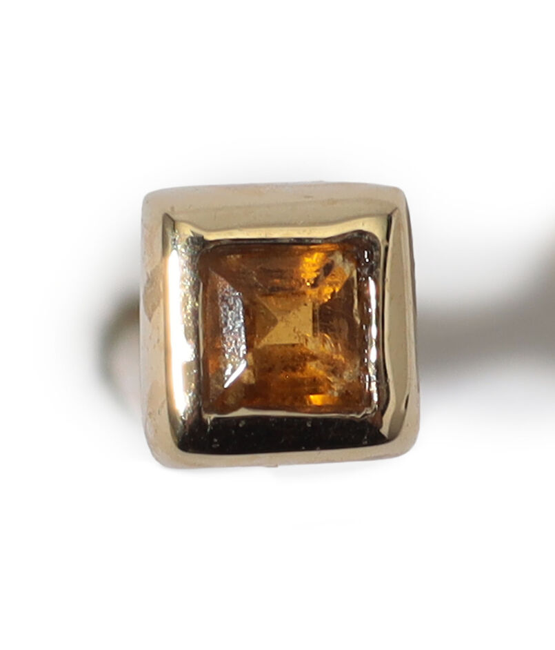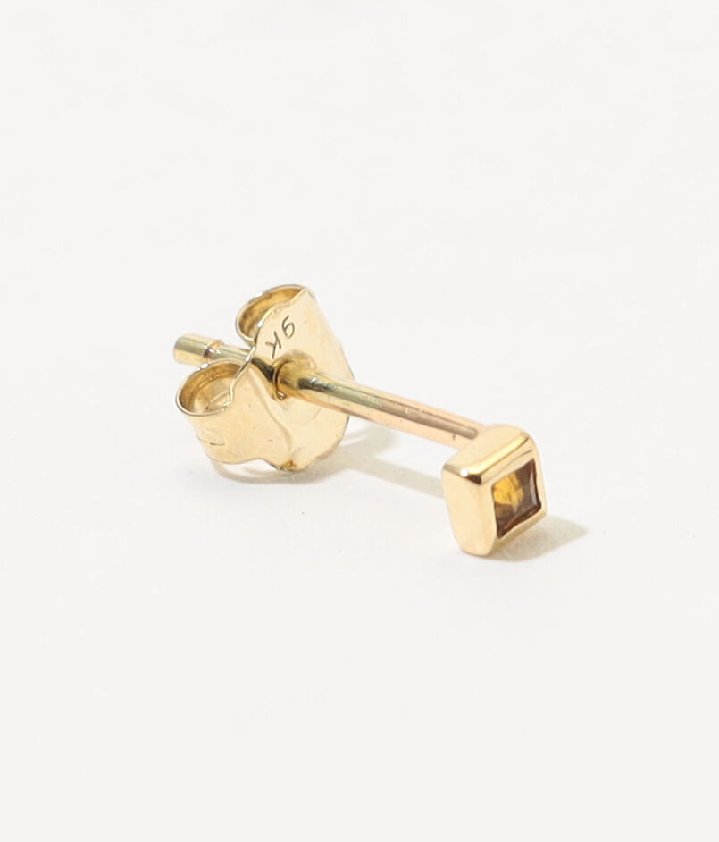プリンセスカットのストーンを9Kイエローゴールドで包み込んだ、ベゼルセッティングのミニスタッドピアス。