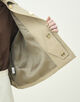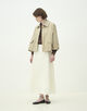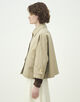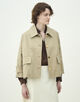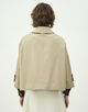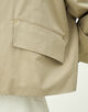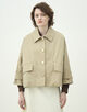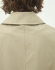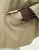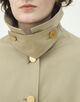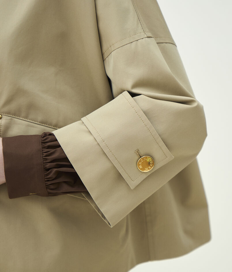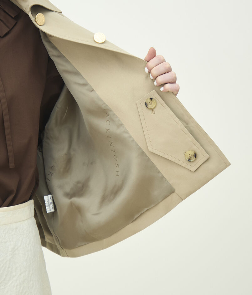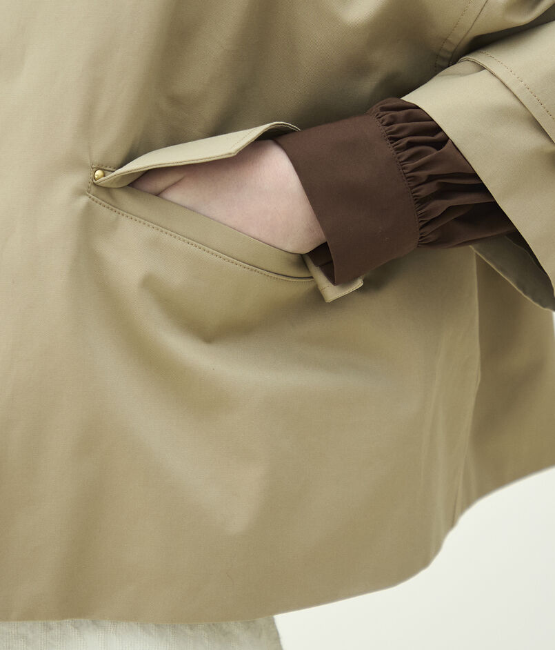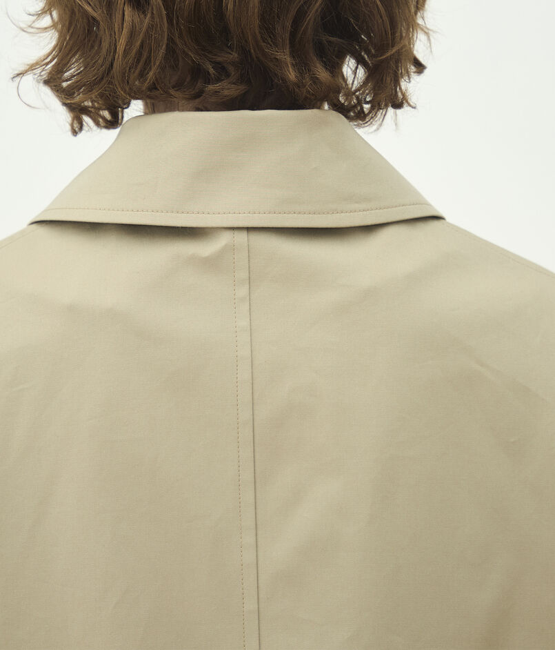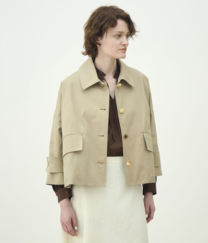 あえてハリのあるトレンチ素材を用いることで、シルエットに軽やかさと立体感が生まれ、正統派トレンチコートの印象をモダンにブラッシュアップしています。
