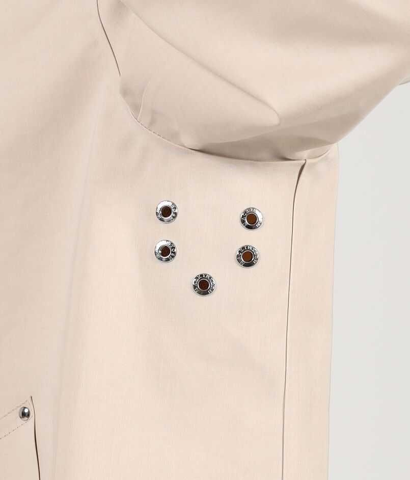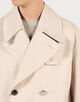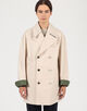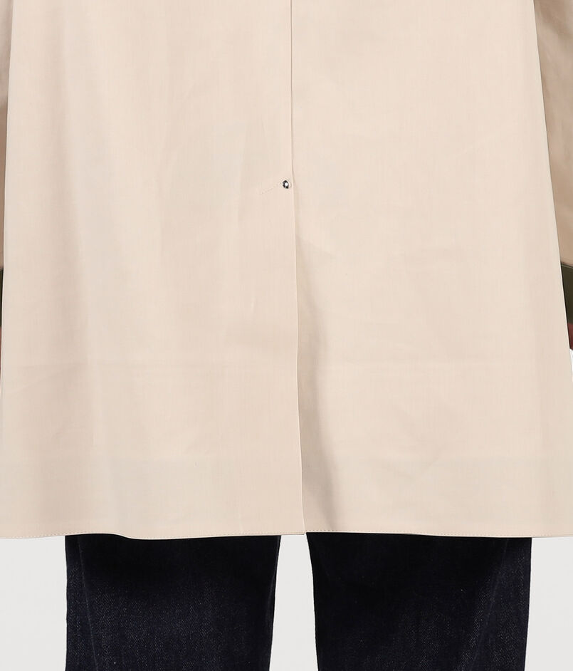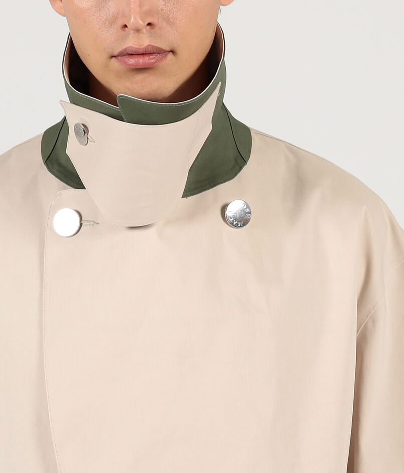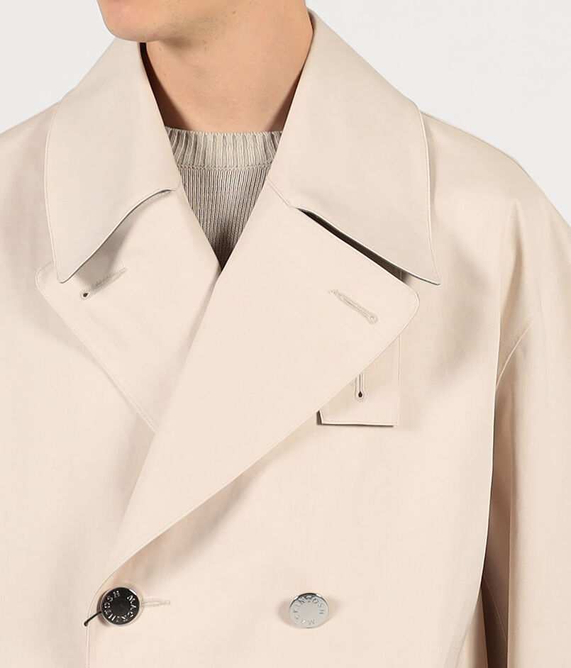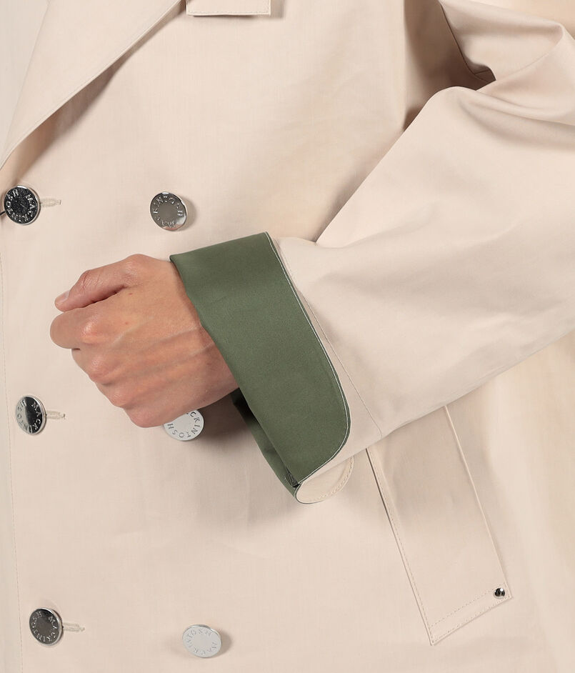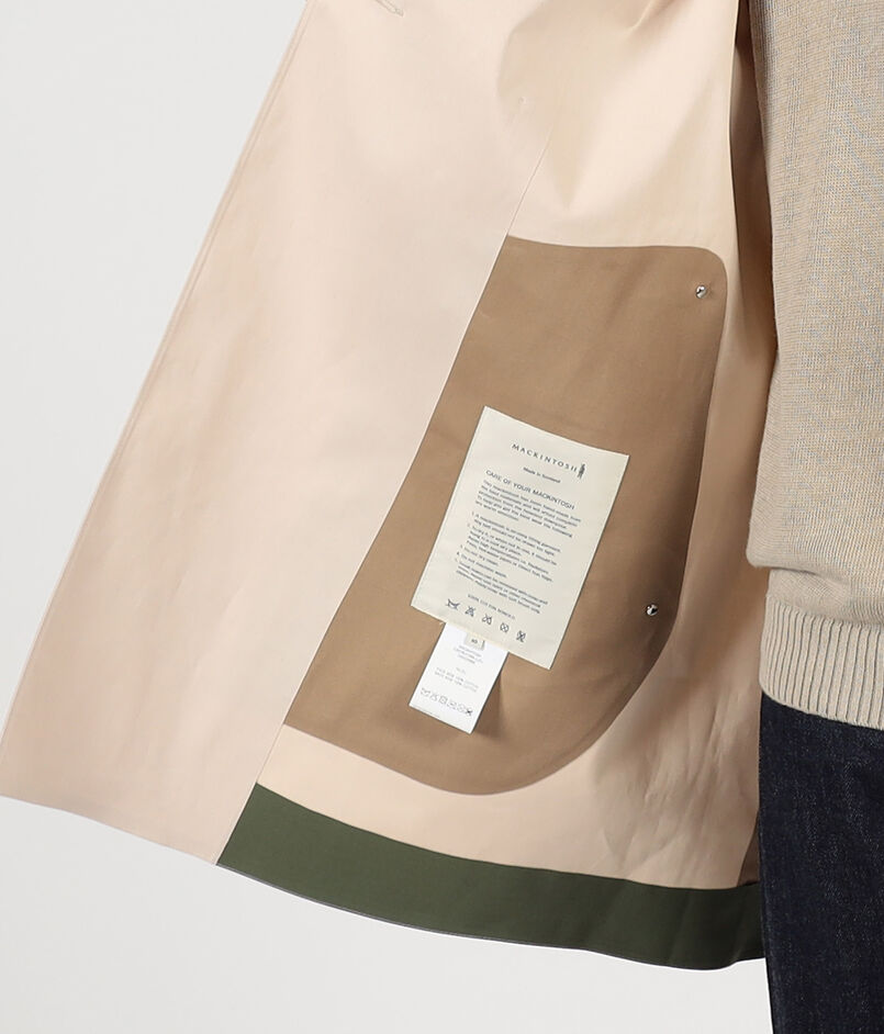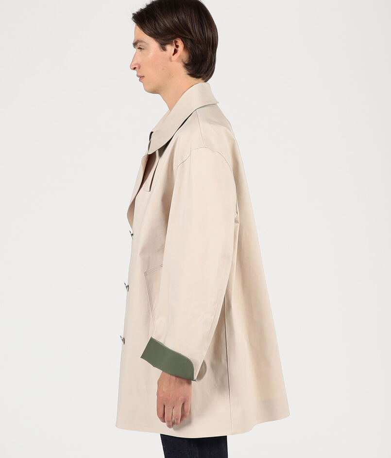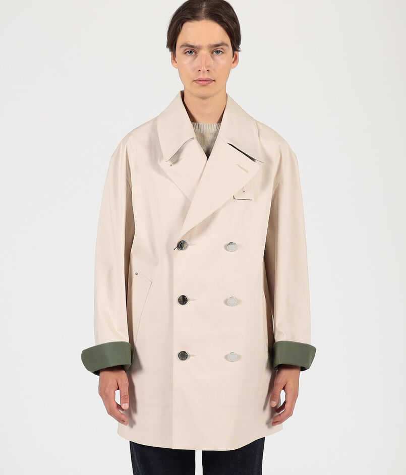 コントラストカラーの襟とスカラップ袖口が特徴の〈MACKINTOSH〉定番のゴム引きコットンを使用したオーバーサイズシルエットのPコート。