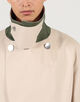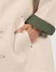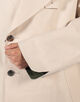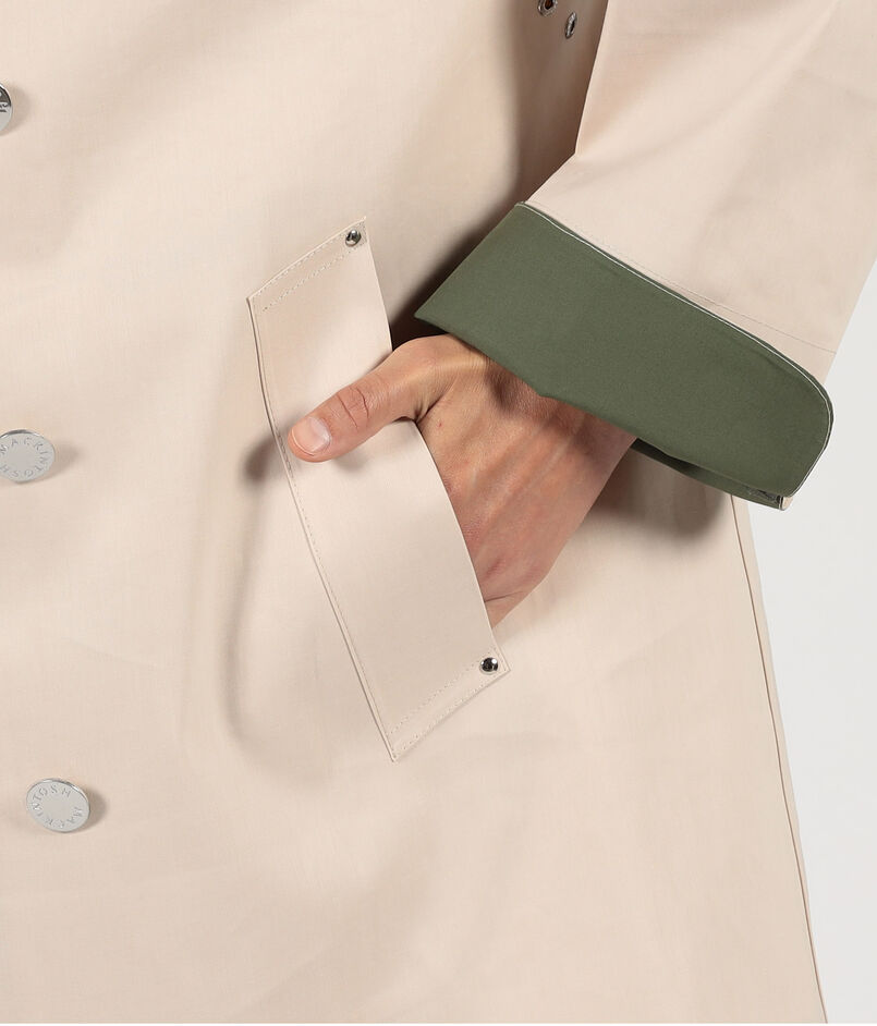 伝統的なゴム引きコットンで作られたコートは 100% 防水で、裾と縫い目は手作業でテープで留められており、雨風をシャットアウトします。