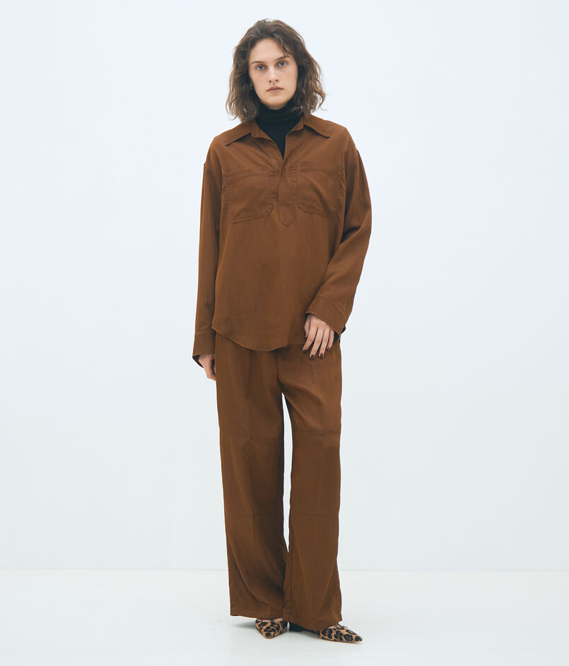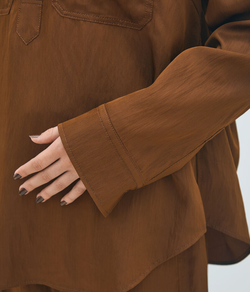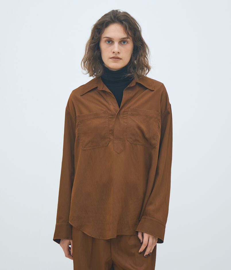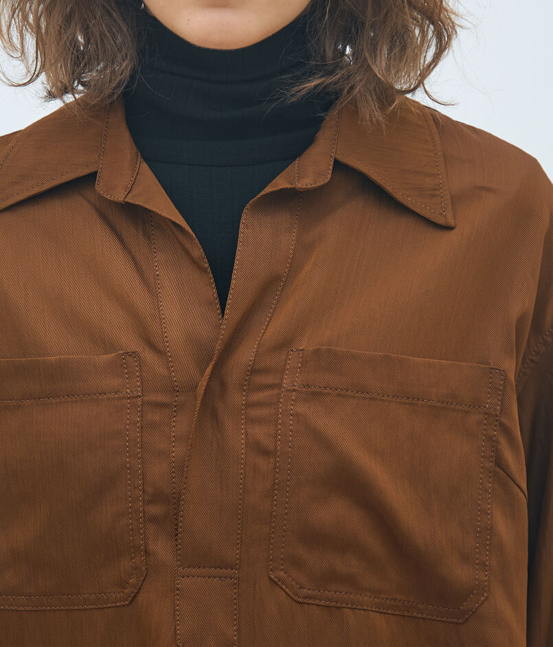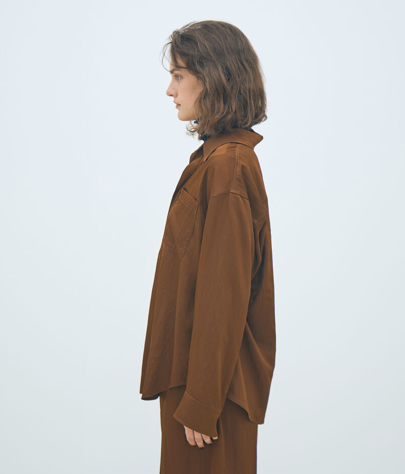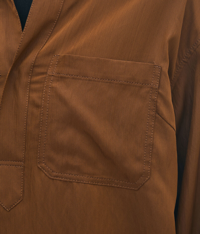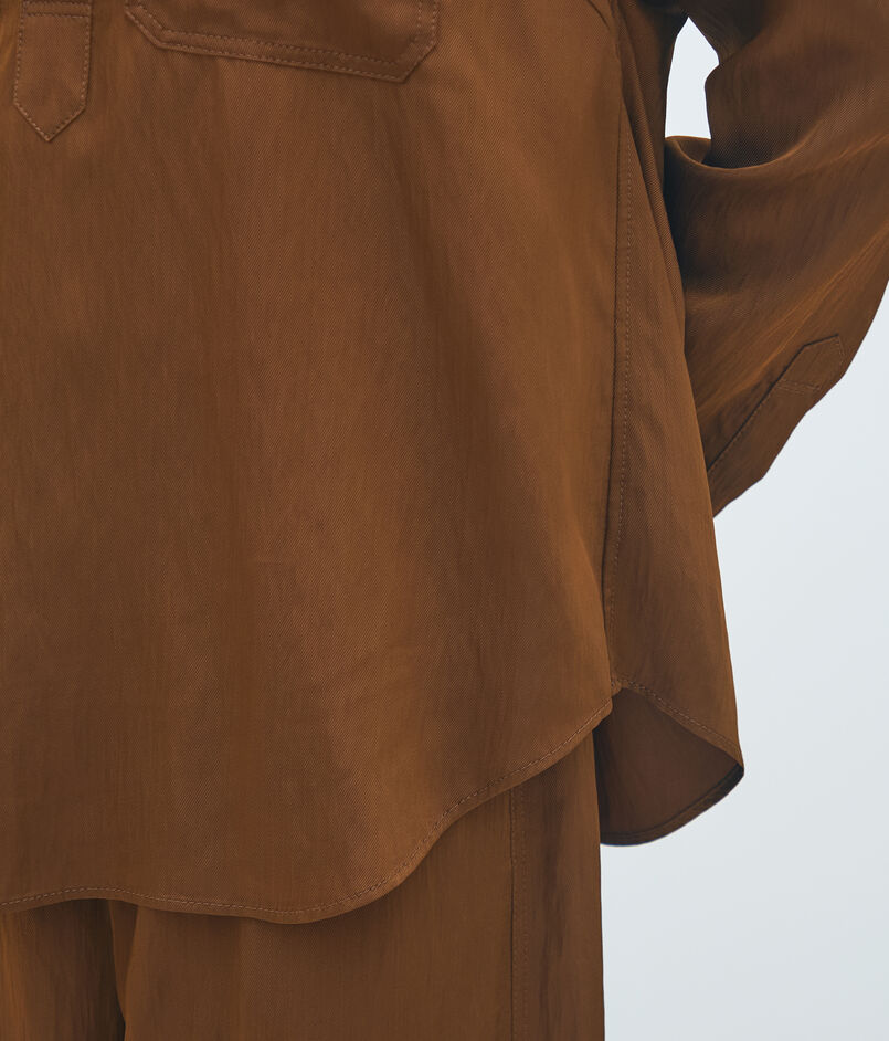 タテ糸とヨコ糸に異なる素材を使用した、適度なハリと落ち感を併せ持ったカルゼ素材のシャツ。