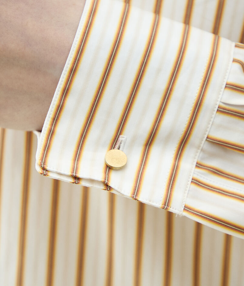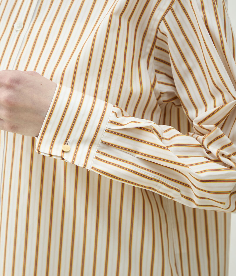 あえて襟を大きくし、カフスボタンをメタルにすることでエレガントな雰囲気をプラスしています。