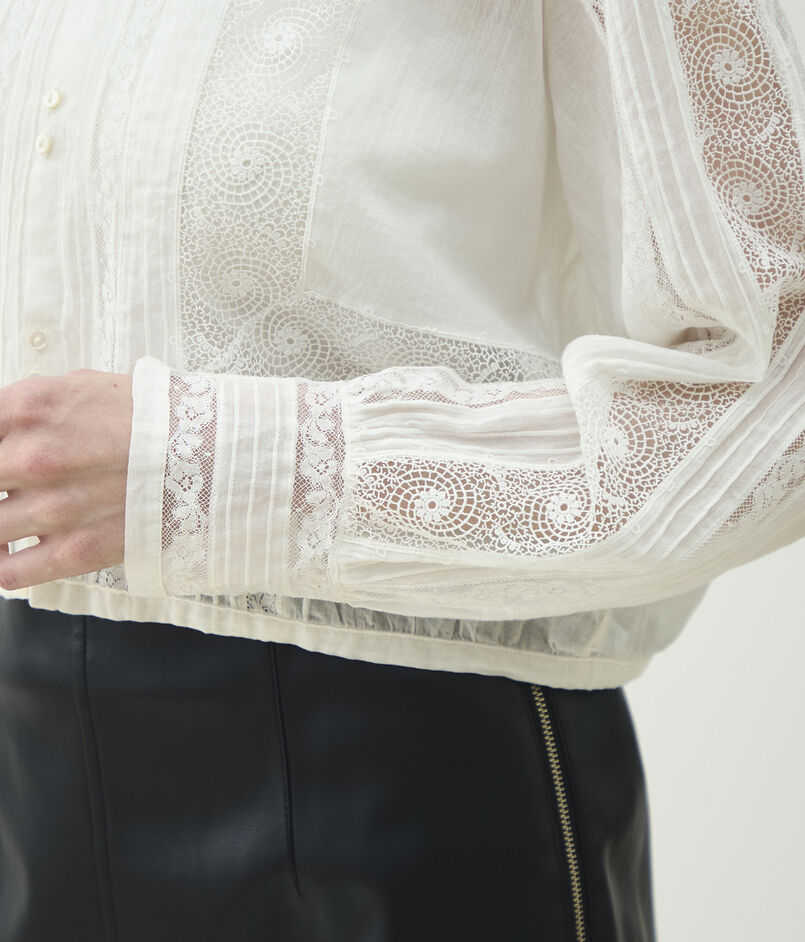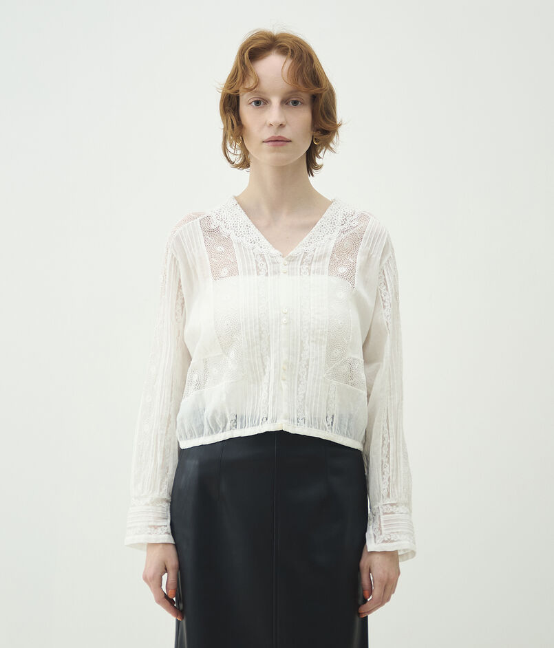 繊細なコットンローンに幾重にも繋ぎ合わせたフランスレースや一本一本丁寧に縫ったピンタックなど、ビンテージのもつ温かみを現代に蘇らせつつ、今のスタイルにフィットするようサイズ感や袖の長さ、着合わせるもののイメージが膨らむようデザインを工夫しています。