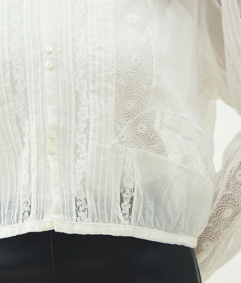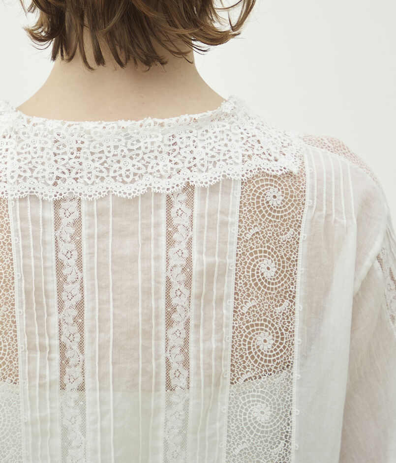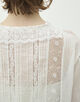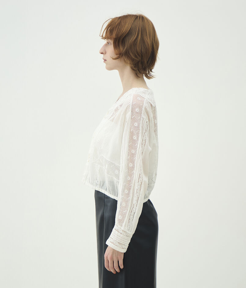 繊細なコットンローンに幾重にも繋ぎ合わせたフランスレースや一本一本丁寧に縫ったピンタックなど、ビンテージのもつ温かみを現代に蘇らせつつ、今のスタイルにフィットするようサイズ感や袖の長さ、着合わせるもののイメージが膨らむようデザインを工夫しています。
