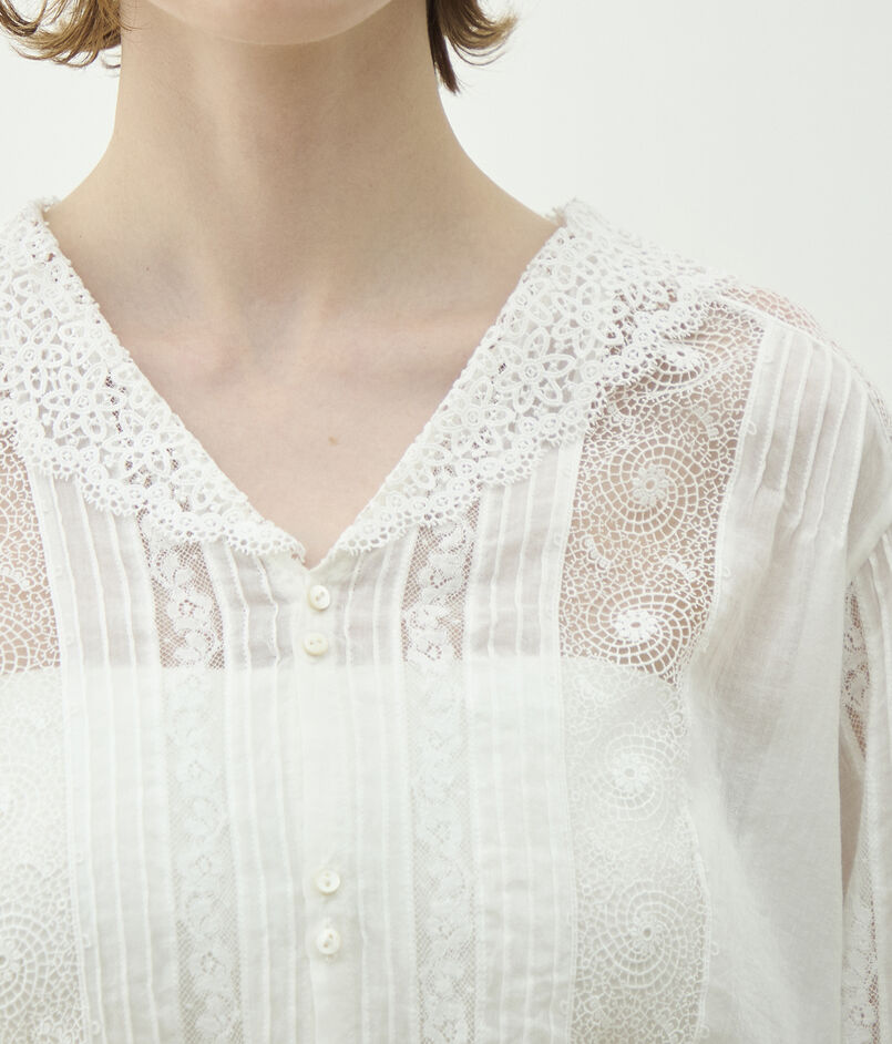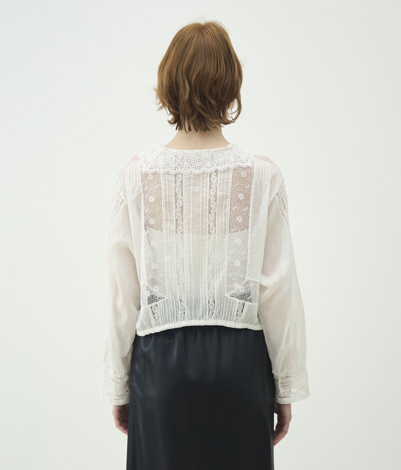 繊細なコットンローンに幾重にも繋ぎ合わせたフランスレースや一本一本丁寧に縫ったピンタックなど、ビンテージのもつ温かみを現代に蘇らせつつ、今のスタイルにフィットするようサイズ感や袖の長さ、着合わせるもののイメージが膨らむようデザインを工夫しています。